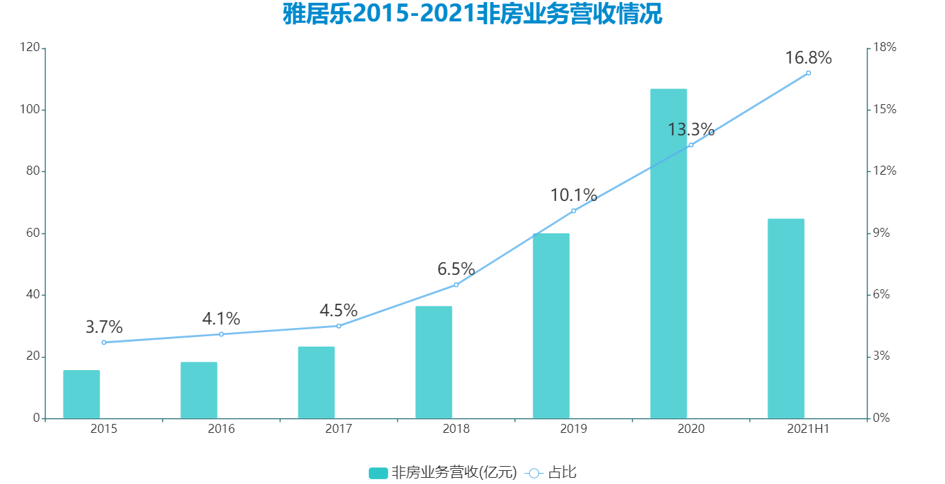 可以窺見,截至2021年中期,雅居樂非地產(chǎn)板塊營收離此前陳卓林許下的占比一半宏愿尚有距離,但比例已經(jīng)提升至接近16.8%,營收同比增長54%。