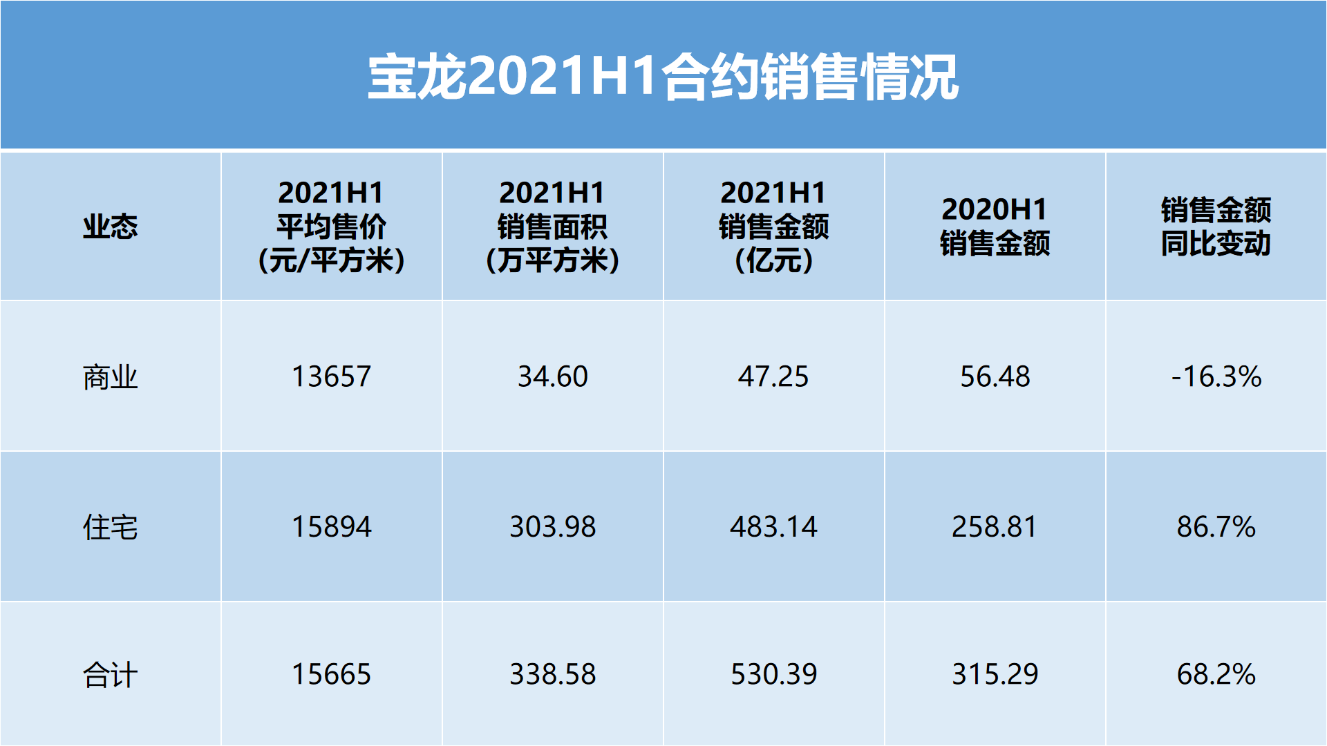 2021年上半年,寶龍合約銷售額為315.29億元,較2020年同期上漲68.2%。其中住宅銷售額為258.81億元,較2020年同期上漲86.7%;商業(yè)物業(yè)銷售額56.48億元,較2020年同期下降了16.3%。