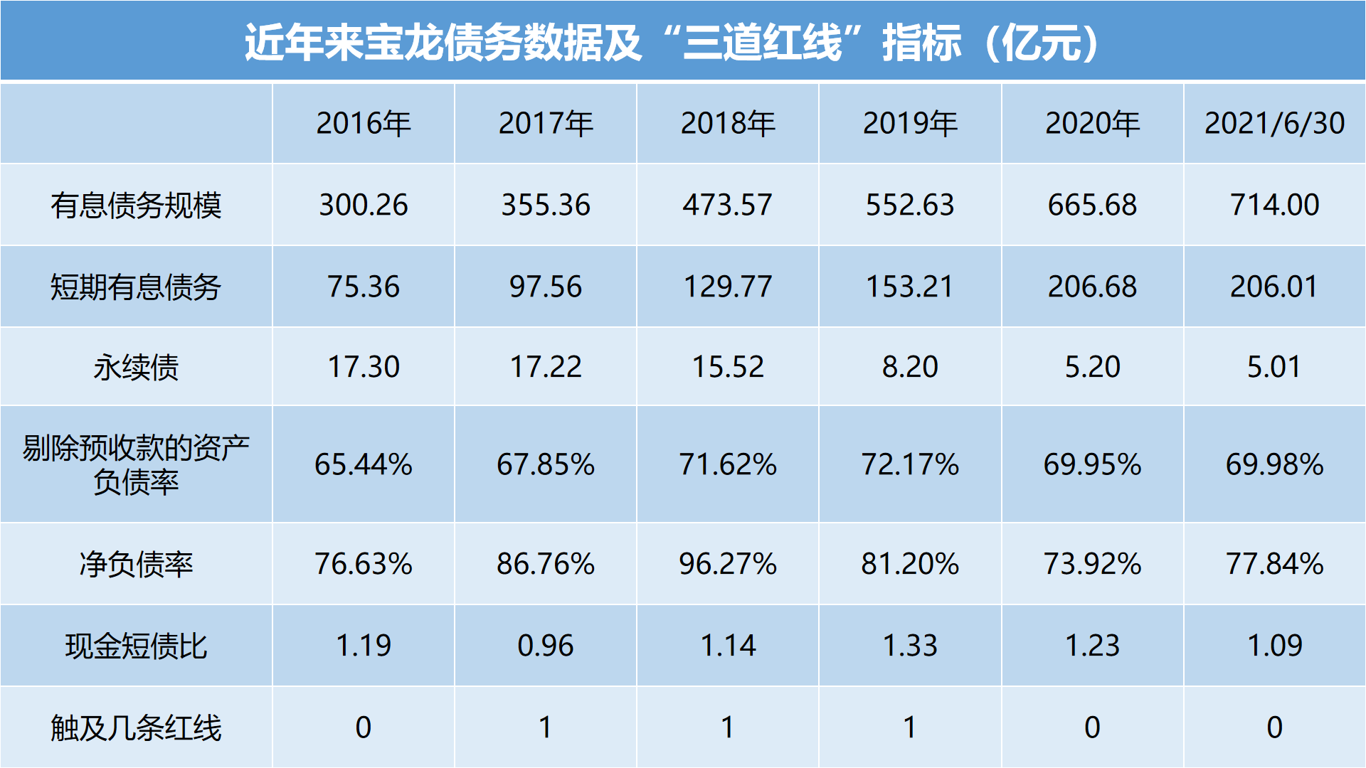 三道紅線方面,截至2021年6月底,寶龍地產(chǎn)剔除預收后的資產(chǎn)負債率為69.98%。較2020年底69.95%增長0.03個百分點;現(xiàn)金短債比為1.09,較2020年底的1.23有所下滑;凈負債率為77.8%,較2020底的73.9%增長3.9個百分點至。若將永續(xù)債計為負債,調整后凈負債率為79.4%。