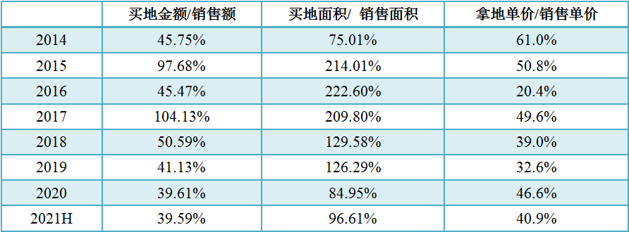 旭輝2014-2021年買地強(qiáng)度和金額
