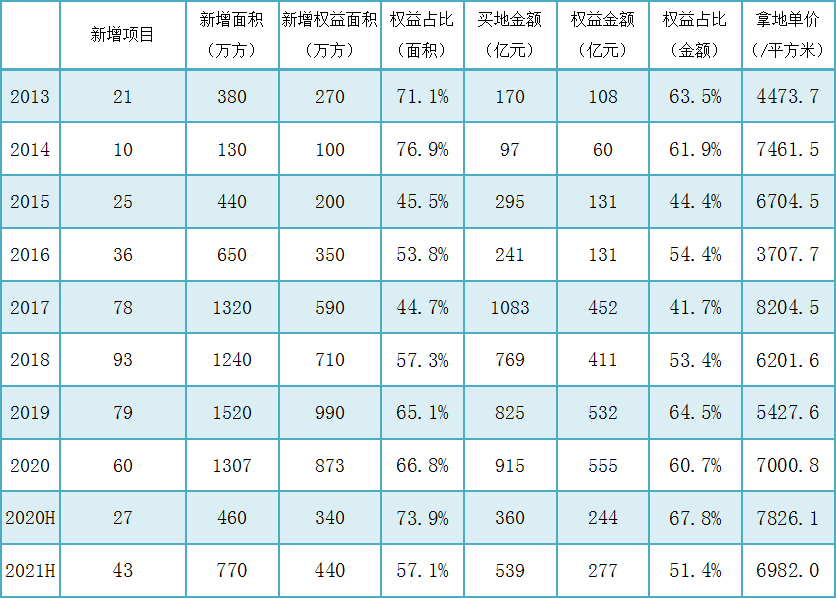 2021年上半年,旭輝拿下了43個(gè)新項(xiàng)目,新增可售貨值1279億元??傄?guī)劃建筑面積約為770萬平方米,其中旭輝權(quán)益占440萬平方米,合同總代價(jià)約為539億元,權(quán)益應(yīng)付277億元,平均土地收購(gòu)成本約為每平方米6982元。
