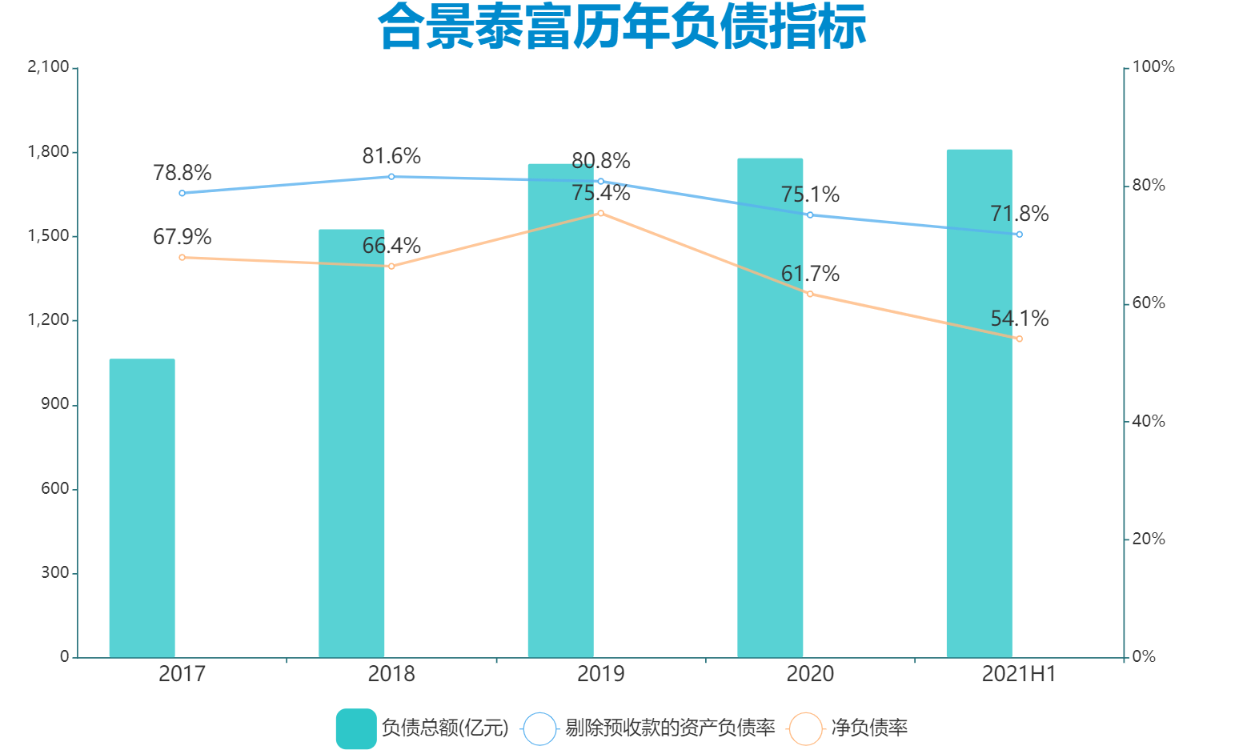 截至2021年上半年,合景泰富凈負(fù)債率為54.1%下降7.6個(gè)百分點(diǎn);非受限的現(xiàn)金短債比為1.8倍,提升了0.2倍;扣除預(yù)收賬款的資產(chǎn)負(fù)債率降至71.8%,較2020年下降3.3個(gè)百分點(diǎn),接近達(dá)標(biāo)。