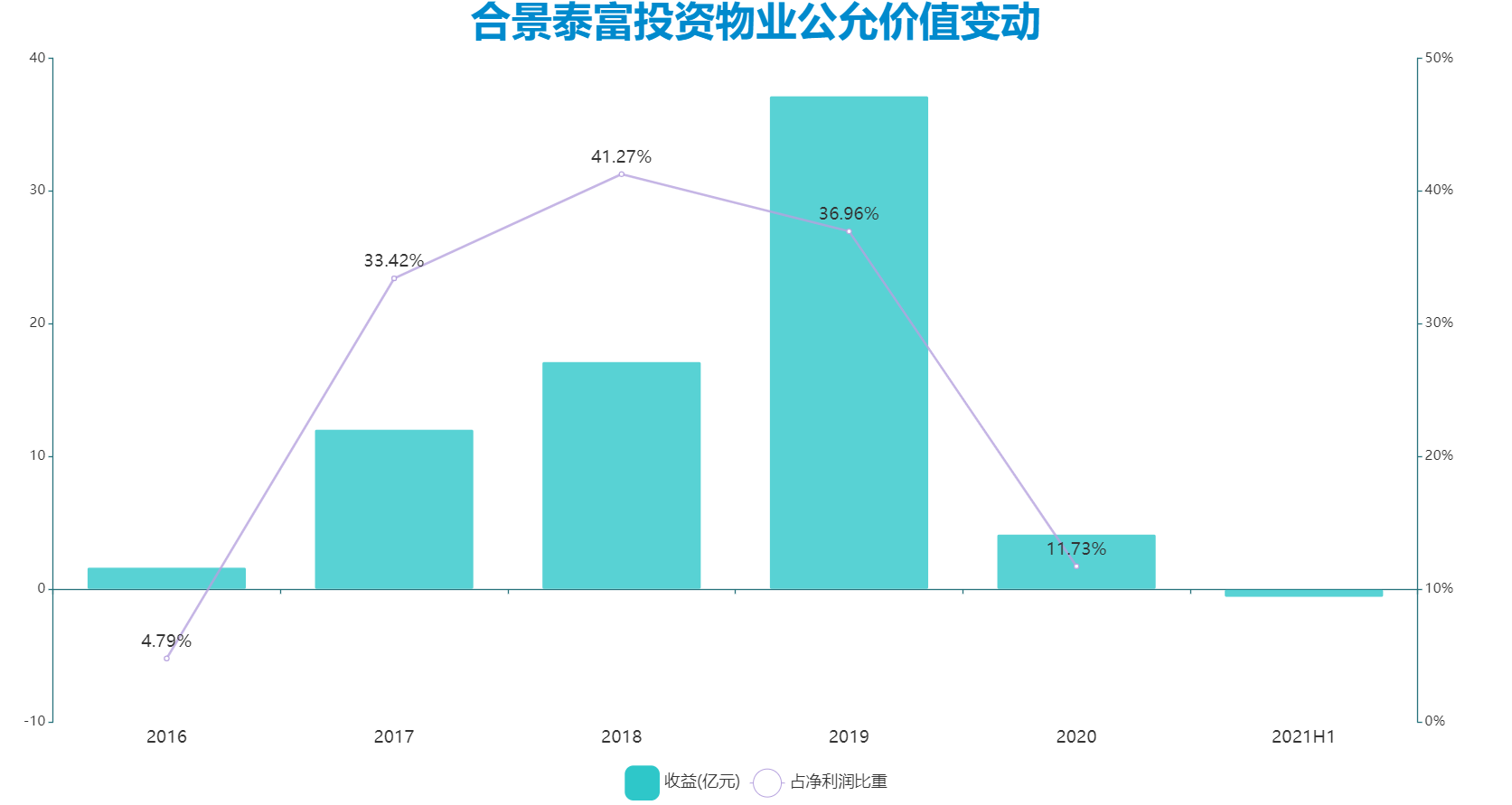 可以發(fā)現(xiàn),近幾年合景泰富“投資物業(yè)公允價(jià)值收益”總和占凈利潤(rùn)比重均有大幅增加。2020年,投資物業(yè)公允價(jià)值收益出現(xiàn)大幅下降,同比減少88.83%,僅余4.15億元,該年合景泰富錄得近十一年內(nèi)首次凈利潤(rùn)下滑。