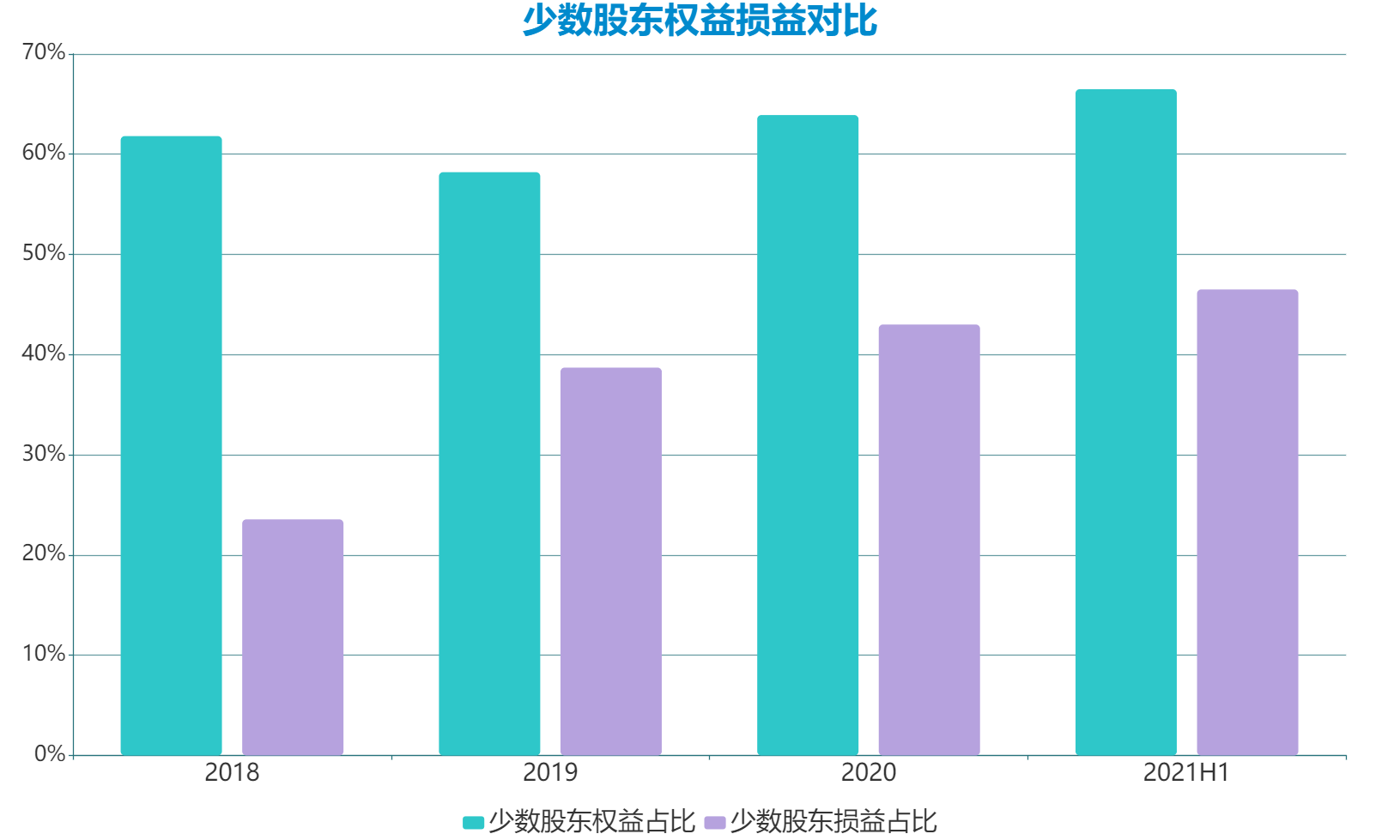 2018年至2021年上半年,中梁少數(shù)股東權(quán)益占比分別為61.8%、58.2%、63.9%及66.48%,而2018-2020年中梁少數(shù)股東損益占比則分別為23.56%、38.7%和43.0%。