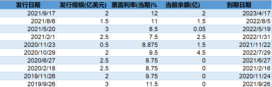 為進一步緩解融資成本上升,又因為境內(nèi)融資受阻,中梁控股也多次選擇于海外發(fā)債。截至2021年9月17日,累計發(fā)行了10筆美元債,最近一筆是以12%票面利率發(fā)行了2億美元2023年到期優(yōu)先票據(jù)。