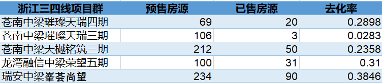 據(jù)觀點新媒體不完全統(tǒng)計,以中梁在浙江三四線城市布局項目為例,蒼南中梁璀璨天瑞四期預(yù)售房源為69套,已售房源卻連一半都不到,去化率為28.98%;蒼南中梁天樾銘筑三期的去化情況,預(yù)售房源106套中只賣出3套,去化率僅2.83%;與融信合作開發(fā)的龍灣融信中梁榮望五期銷售數(shù)據(jù)也并不高調(diào),只售出三分之一房源。