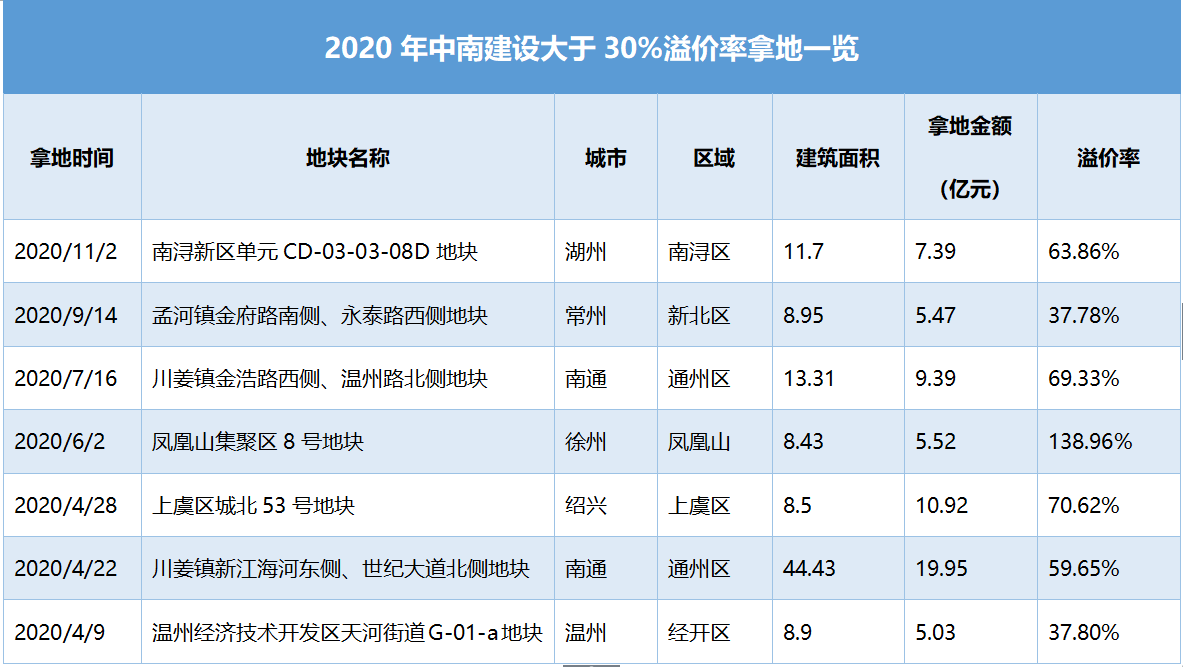 根據(jù)資料顯示,2020年中南建設(shè)溢價率高于60%的項目就有五個以上,其中2020年6月徐州鳳凰山集聚區(qū)8號地塊溢價率高達(dá)138.9%。數(shù)據(jù)推及2019年,中南建設(shè)高溢價率地塊無疑都轉(zhuǎn)化成了壓力,壓在了2021年。