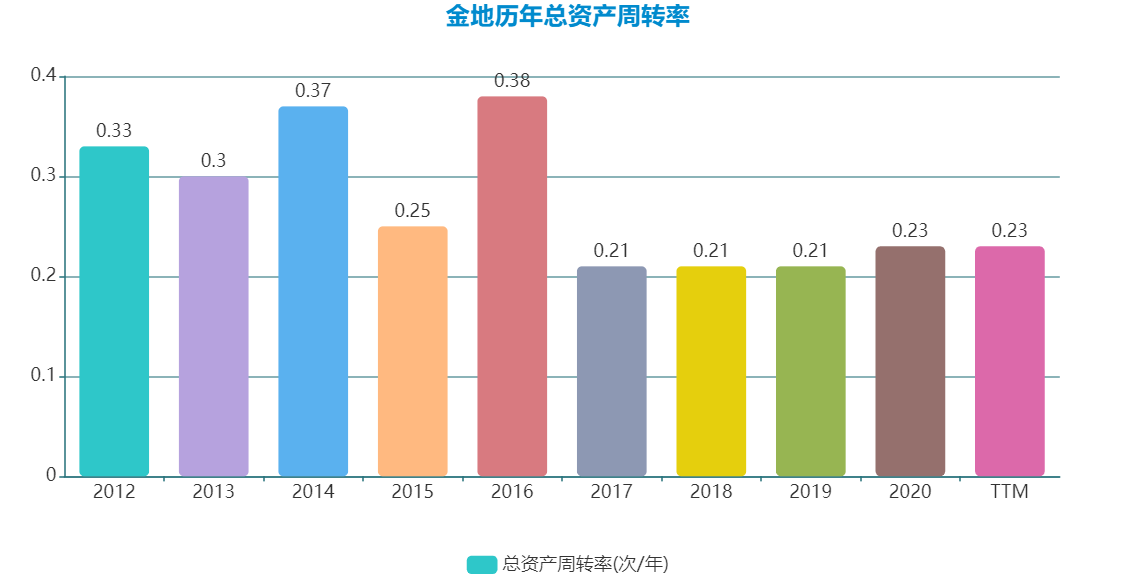 但正如前文所述,在行業(yè)沒(méi)有技術(shù)革新背景下,經(jīng)營(yíng)效率不會(huì)得到大幅提升。就金地而言便是如此,自2017年之后經(jīng)營(yíng)效率已經(jīng)沒(méi)有太大變化,基本保持在總資產(chǎn)周轉(zhuǎn)率0.21次/年至0.23次/年水平。