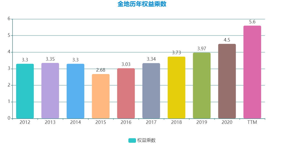 但可以看到,實(shí)際上金地ROE水平并沒(méi)有像凈利潤(rùn)下滑得這么快,主要也是因?yàn)榻鸬卦谟绊慠OE水平的最后一個(gè)主要指標(biāo)權(quán)益乘數(shù)上進(jìn)行了放大杠桿的操作,以此來(lái)保證ROE水平的穩(wěn)定。