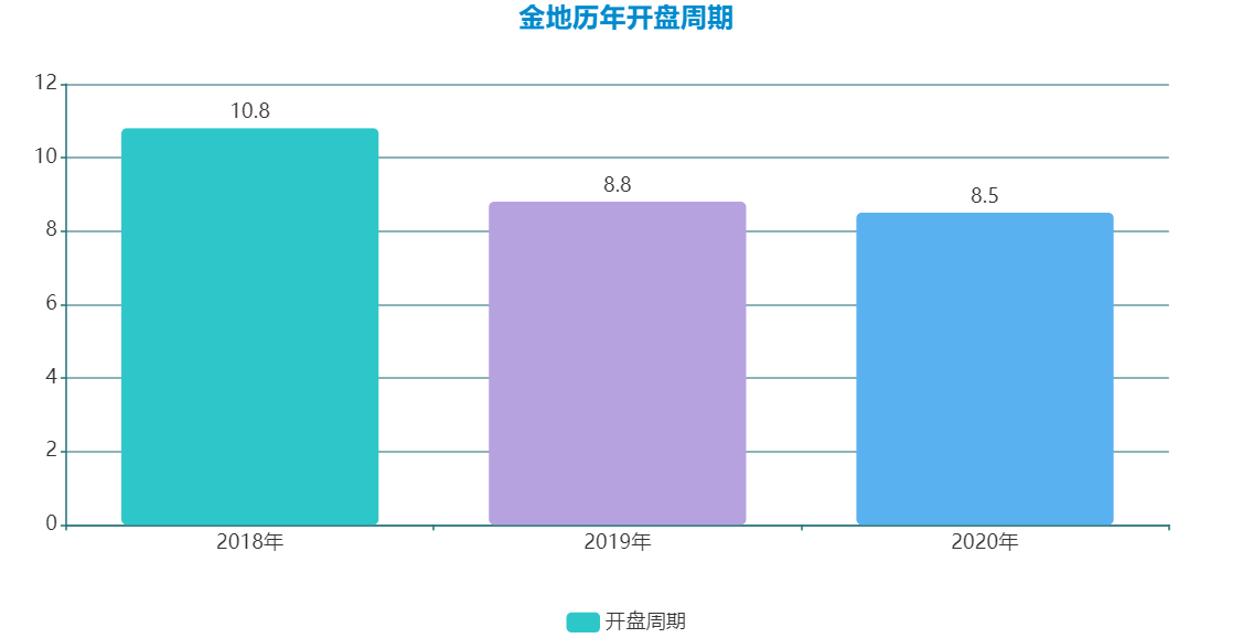 就金地項(xiàng)目平均開(kāi)盤周期而言,目前年報(bào)中披露或在報(bào)道中已經(jīng)出現(xiàn)的數(shù)據(jù),2018年為10.8個(gè)月,2019年為8.8個(gè)月,2020年為8.5個(gè)月。