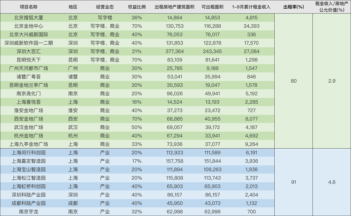 雖然表達(dá)了期望,但對(duì)于持有型物業(yè)態(tài)度還是非常保守。實(shí)際上,目前金地持有物業(yè)中,商業(yè)、商辦項(xiàng)目大部分持股比例不超50%,產(chǎn)業(yè)園項(xiàng)目持股比例最高僅40%。