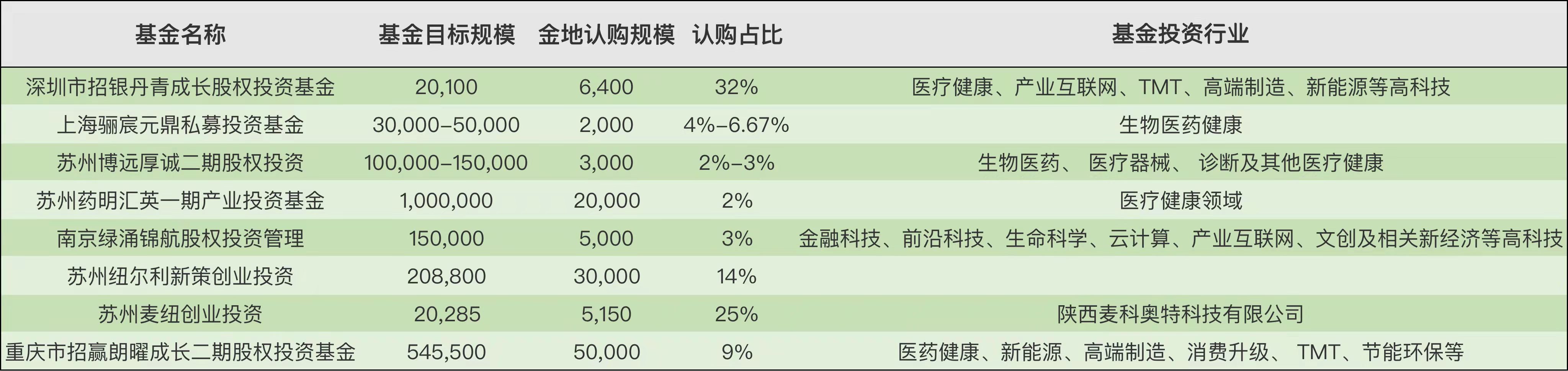 資料顯示,金地2021年陸續(xù)認(rèn)購(gòu)了包括深圳市招銀丹青成長(zhǎng)股權(quán)投資基金在內(nèi)的8家投資基金,涉及行業(yè)包括醫(yī)療健康、生物醫(yī)藥、金融科技等。