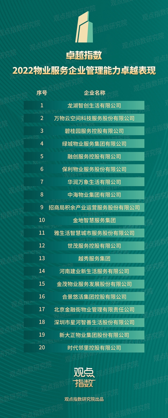 “2022物業(yè)服務企業(yè)管理能力卓越表現(xiàn)”綜合考量消費者對物業(yè)企業(yè)的社區(qū)管理滿意度、增值服務滿意度、人才隊伍建設、領導力與執(zhí)行效率等表現(xiàn)。經過審慎評測后,最終龍湖智創(chuàng)生活、萬物云、碧桂園服務等20家企業(yè)入選。