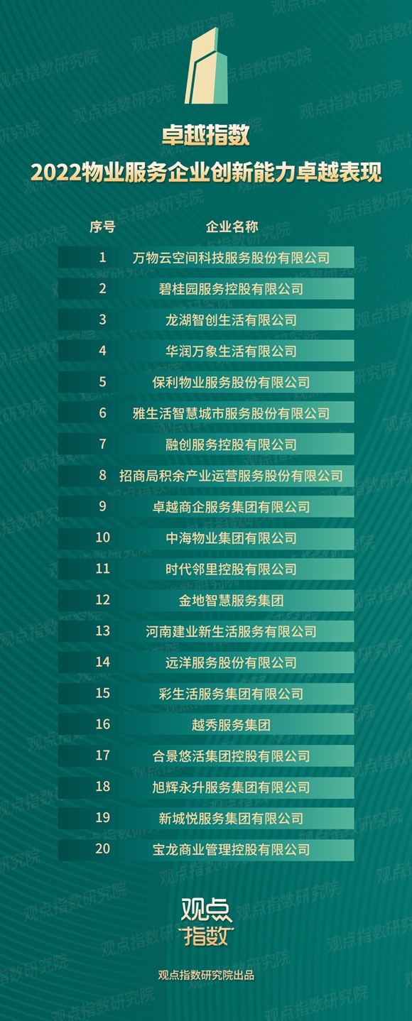 “2022物業(yè)服務(wù)企業(yè)創(chuàng)新能力卓越表現(xiàn)” 綜合研究物業(yè)公司在資本運用與融資、產(chǎn)品及業(yè)務(wù)創(chuàng)新、科技創(chuàng)新與創(chuàng)新運營方式等方面的表現(xiàn),旨在表彰那些勇于變革、打破現(xiàn)有瓶頸,在物業(yè)服務(wù)行業(yè)不同領(lǐng)域進(jìn)行創(chuàng)新探索,并取得突破的物業(yè)服務(wù)企業(yè)。