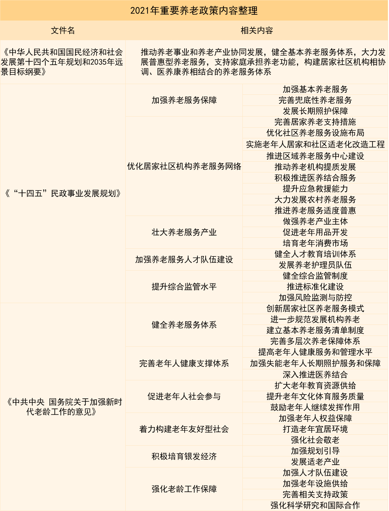 《“十四五”民政事業(yè)發(fā)展規(guī)劃》與《中共中央國務(wù)院關(guān)于加強新時代老齡工作的意見》兩項文件依照綱要的指示,在居家與社區(qū)養(yǎng)老服務(wù)模式、社區(qū)適老化改造、區(qū)域養(yǎng)老服務(wù)中心建設(shè)等方面填充了普惠性養(yǎng)老發(fā)展的主要內(nèi)容;從機構(gòu)養(yǎng)老質(zhì)量管控與加大監(jiān)管力度方面規(guī)范養(yǎng)老機構(gòu)運營;從培育養(yǎng)老服務(wù)人才、培育銀發(fā)經(jīng)濟等方面加大對居民養(yǎng)老的支持。