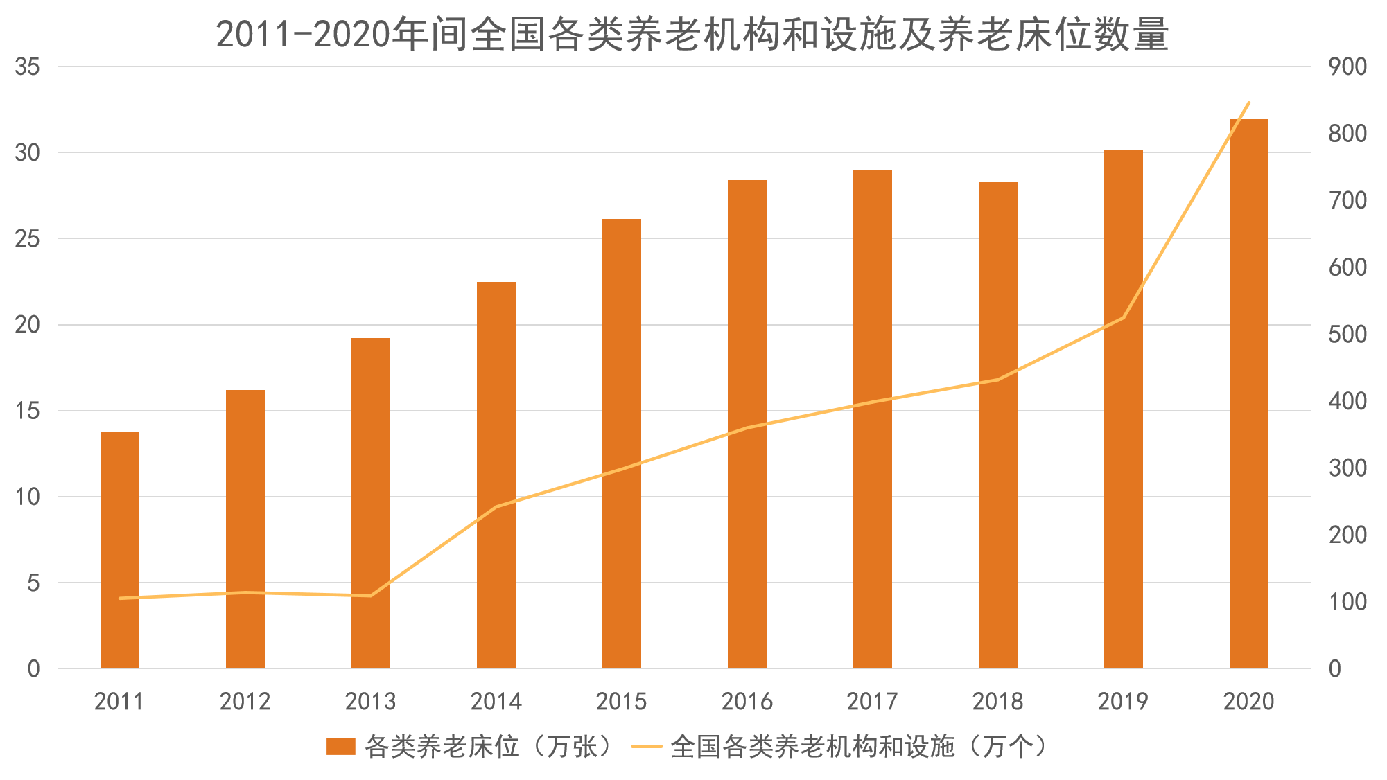 據(jù)民政部公布的數(shù)據(jù),截至2020年底,我國共有各類養(yǎng)老機構(gòu)和實施32.9萬個,各類養(yǎng)老床位合計821萬張,每千名老人僅有養(yǎng)老床位31.1個。
