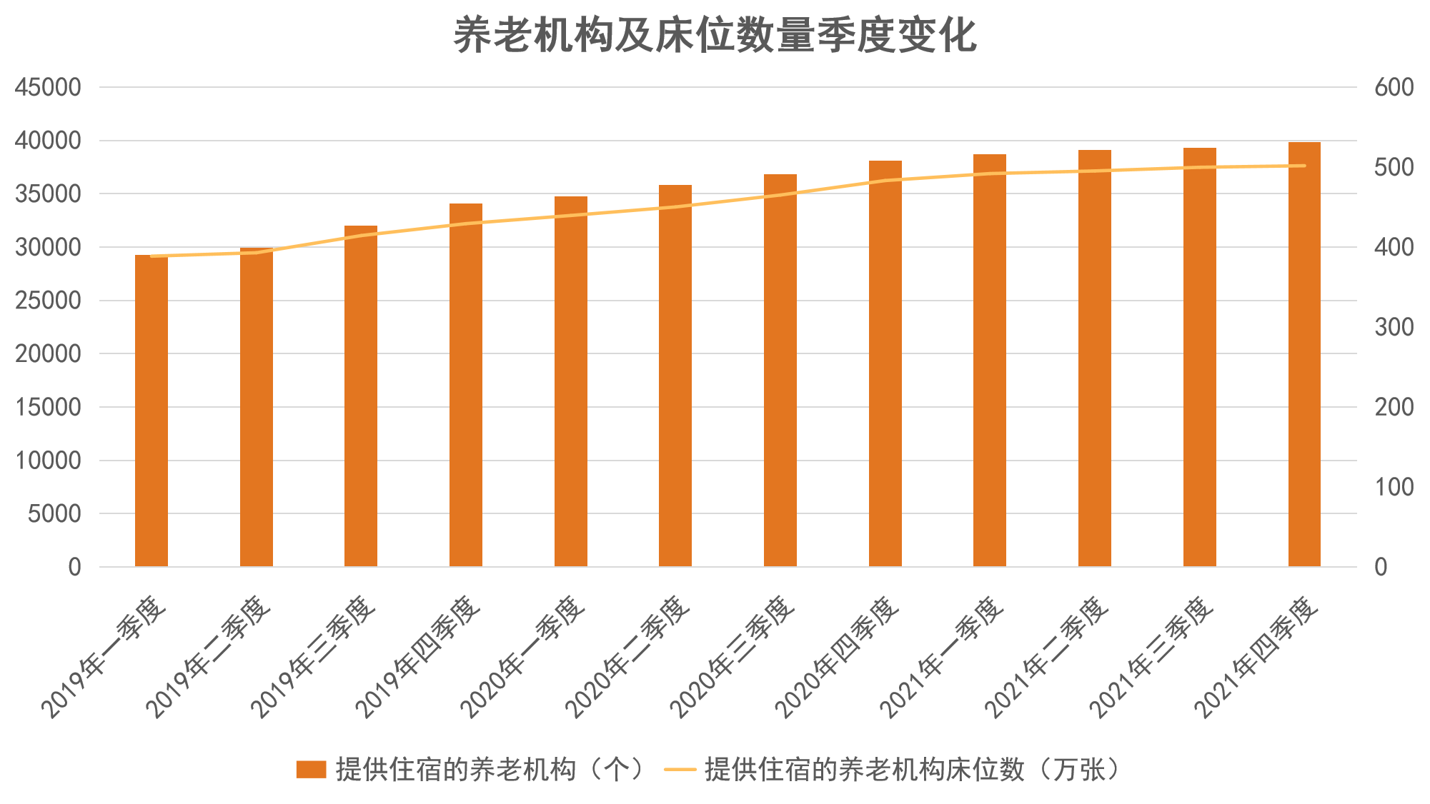 從最新發(fā)布的數(shù)據(jù)看,截至2021年第四季度末,我國共有可提供住宿的養(yǎng)老機構(gòu)39817個,養(yǎng)老機構(gòu)床位501.6萬張。