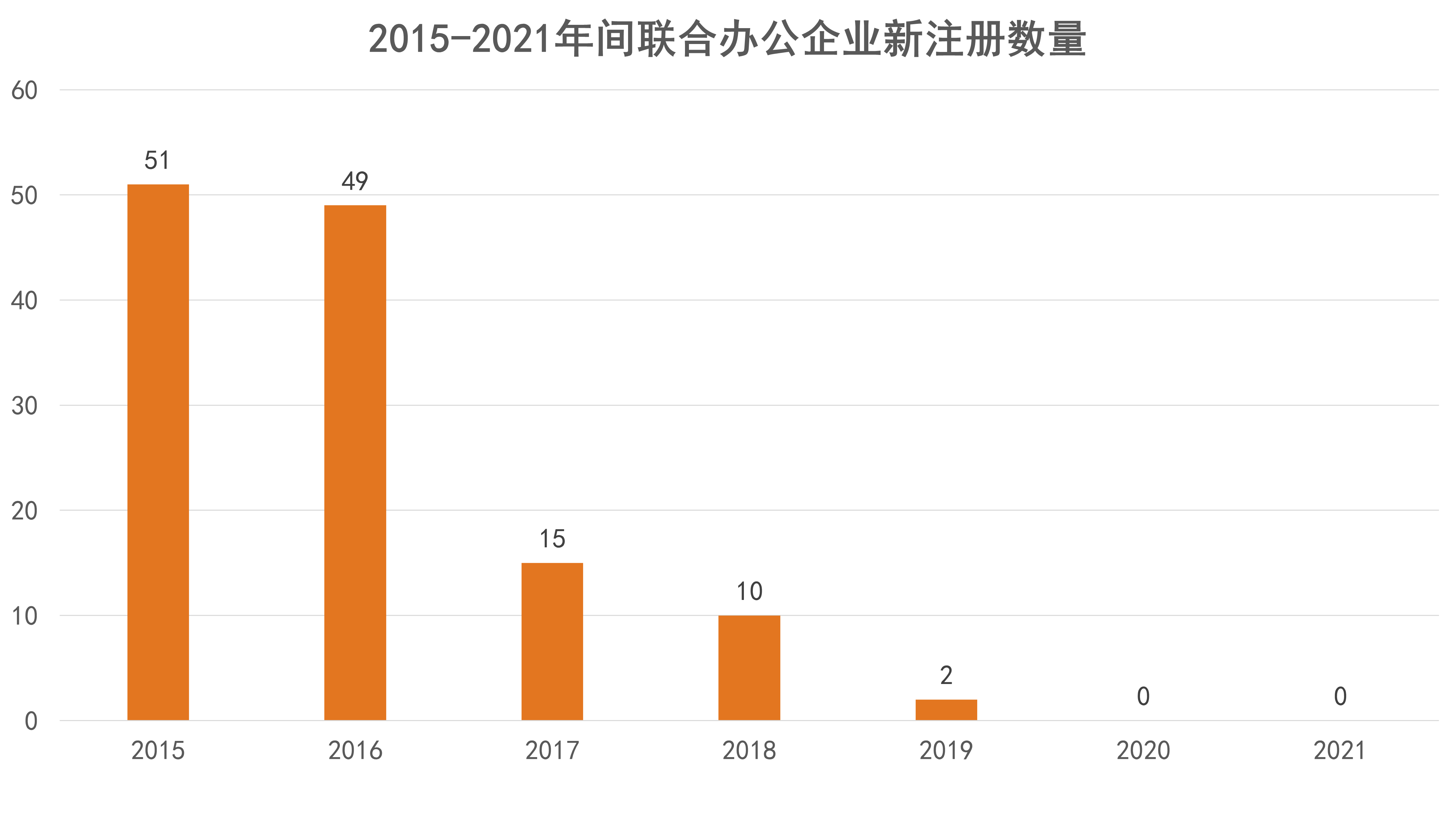 天眼查“聯(lián)合辦公”行業(yè)類目下的數(shù)據(jù)顯示,2021年全年,聯(lián)合辦公企業(yè)注冊(cè)數(shù)為零,辦公空間賽道上已無新增玩家。實(shí)際上,新增辦公空間注冊(cè)企業(yè)數(shù)量從2017年就開始“膝斬”,2020年隨新冠疫情產(chǎn)生的宏觀風(fēng)險(xiǎn)影響,新增注冊(cè)企業(yè)正式歸零。