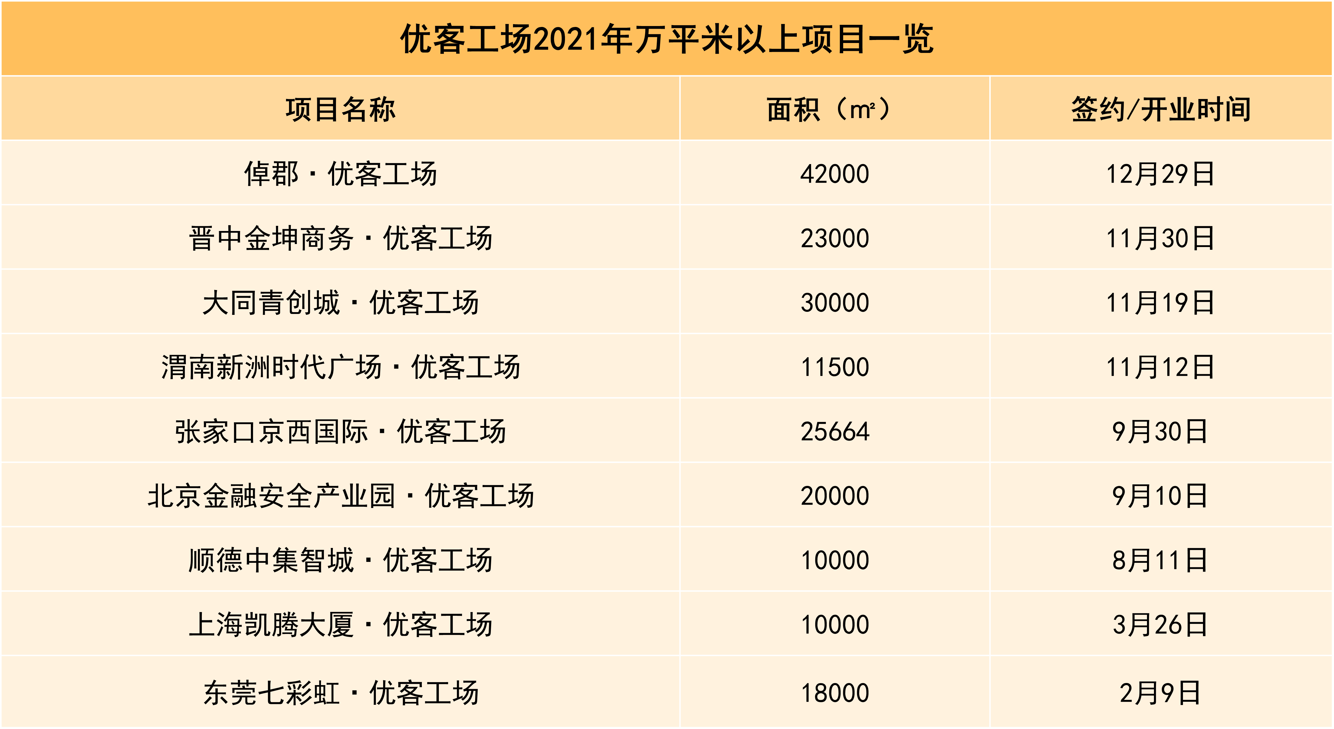 2021年全年,優(yōu)客工場(chǎng)新增簽約一萬平方米以上項(xiàng)目共9個(gè)。在此之前,萬平米以上項(xiàng)目也僅有9個(gè)。
