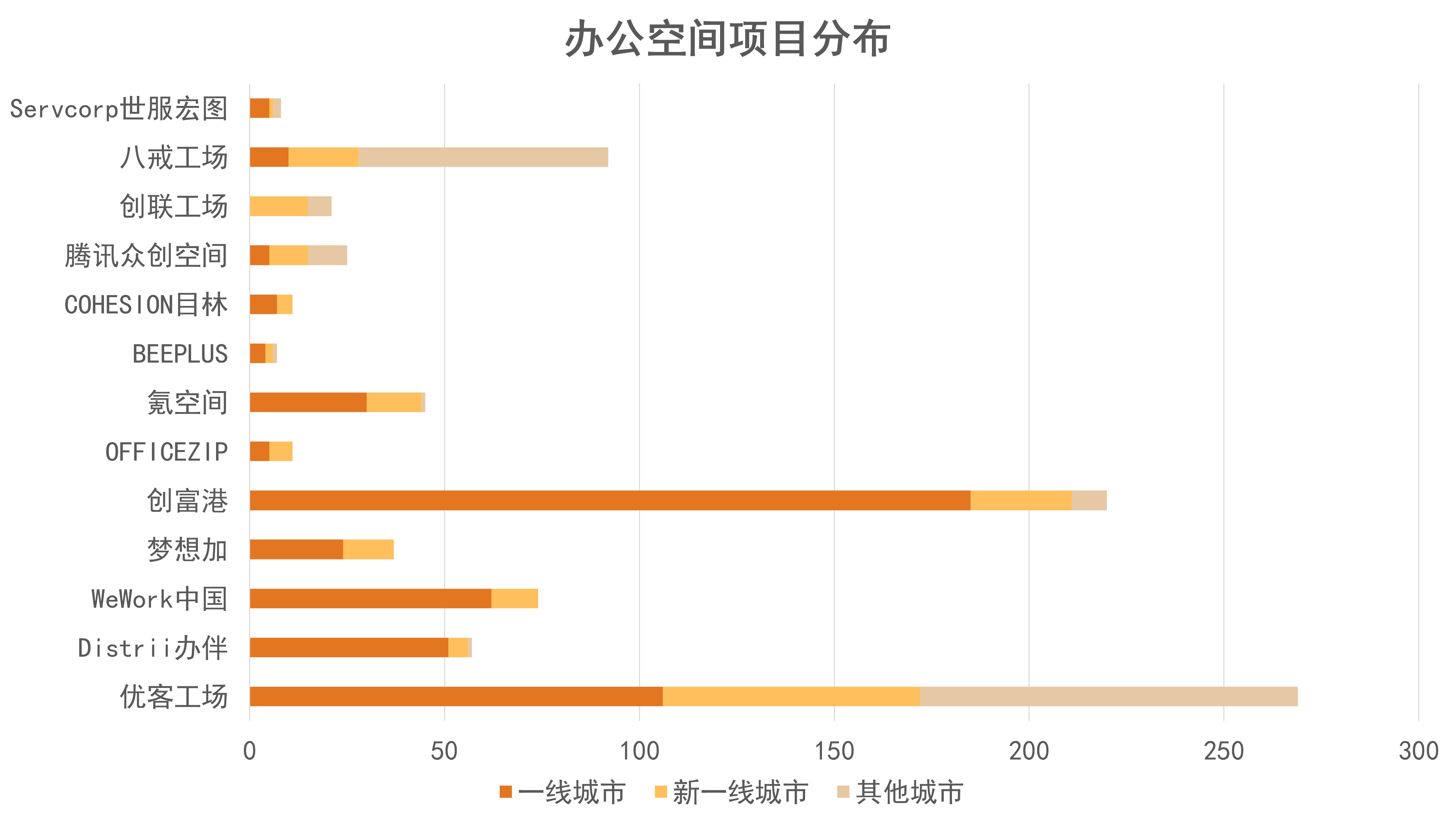 城市布局方面,辦公空間項(xiàng)目基本是高度集中在一線城市和新一線城市,廣大相對(duì)欠發(fā)達(dá)城市所占市場(chǎng)份額不多。