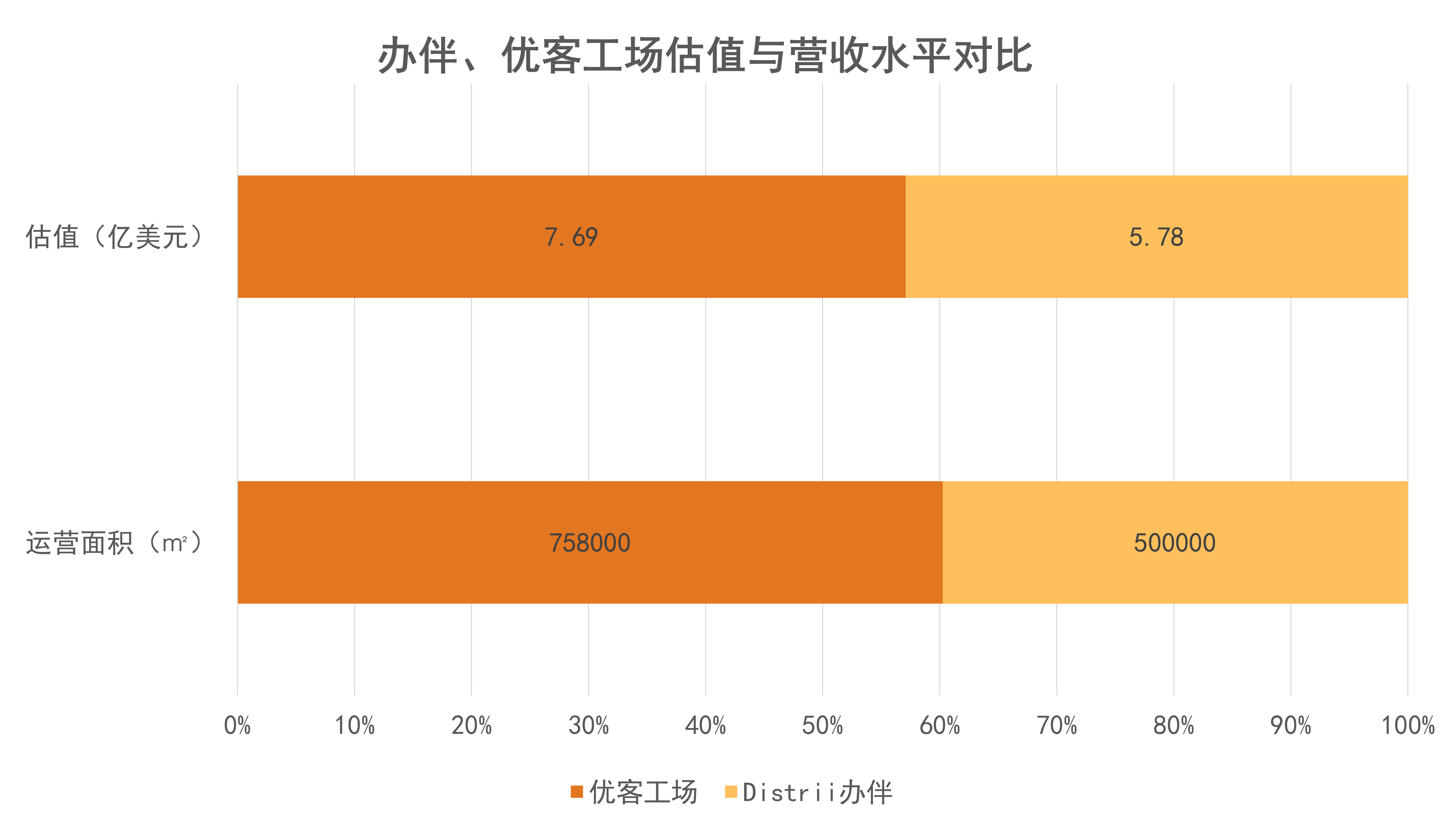 相比優(yōu)客工場(chǎng)上市前的7.69億美元估值,辦伴存在差距,但也相當(dāng)接近。這與它們的在營(yíng)面積相呼應(yīng)——根據(jù)最新披露數(shù)據(jù),優(yōu)客工場(chǎng)營(yíng)運(yùn)面積約為76萬平方米,而辦伴這一數(shù)據(jù)約為50萬平方米。
