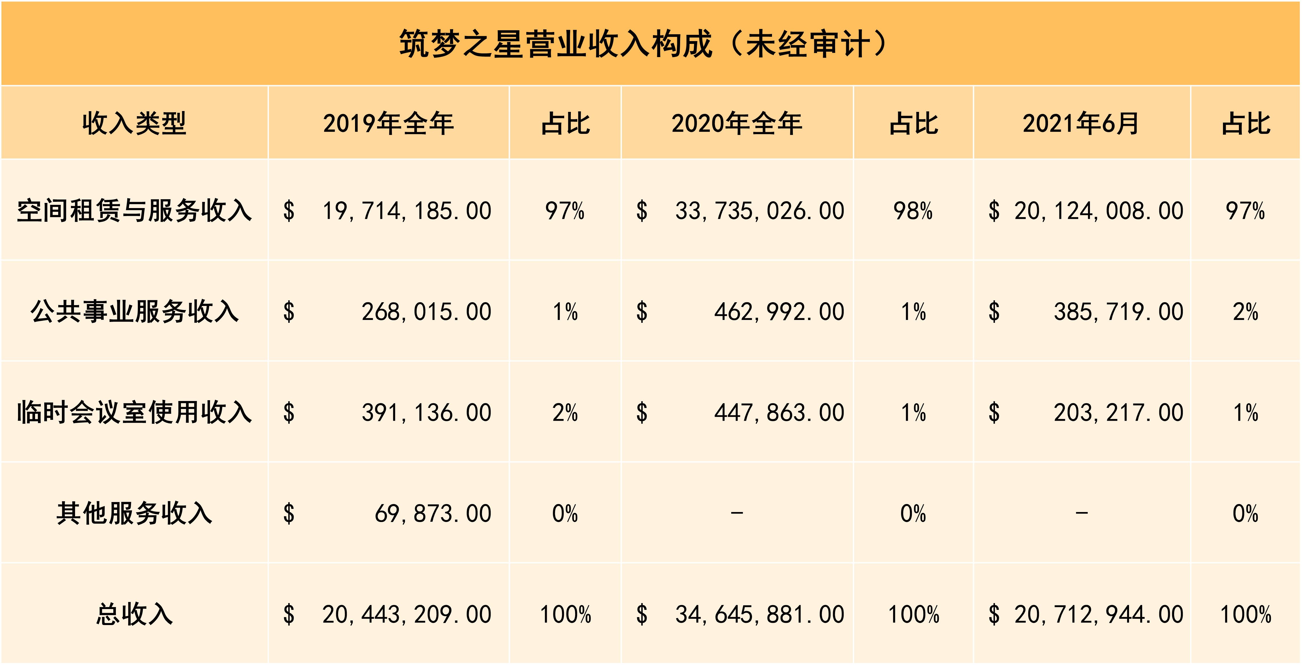 2021年間,筑夢(mèng)之星收入組成為向客戶收取按面積出租辦公空間的費(fèi)用、出租工位費(fèi)用、出租會(huì)議室的費(fèi)用以及收取水電費(fèi)的費(fèi)用。這意味著,筑夢(mèng)之星收入來源幾乎是圍繞重資產(chǎn)產(chǎn)生。其他服務(wù)收入包括特殊定制運(yùn)營(yíng)服務(wù)費(fèi),但近三年來這部分收入總額甚至達(dá)不到七萬美元,規(guī)模小到可以忽略不計(jì)。