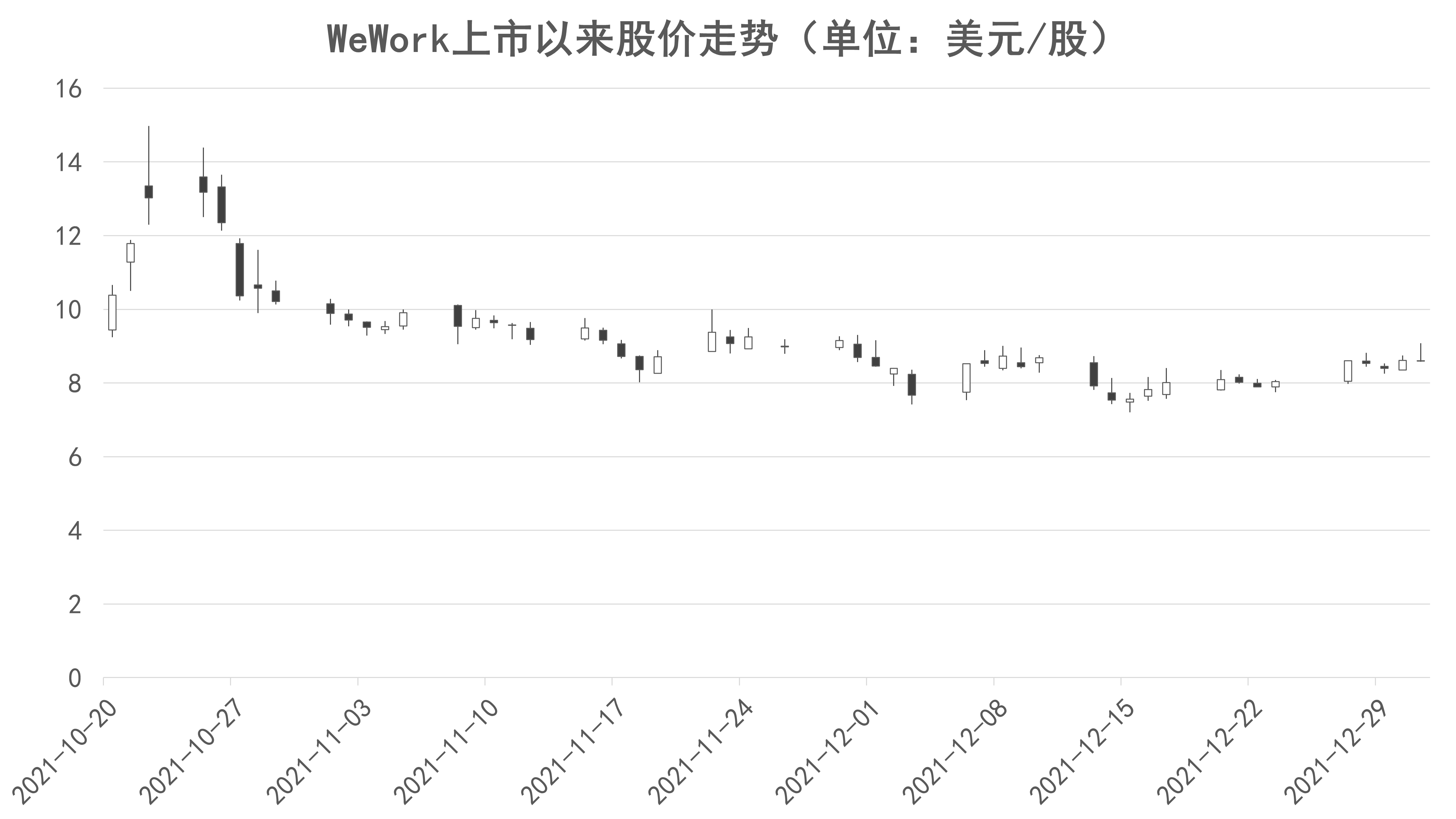 由圖可見,WeWork除了上市后幾天有一波沖高,其余時(shí)間里表現(xiàn)不溫不火。