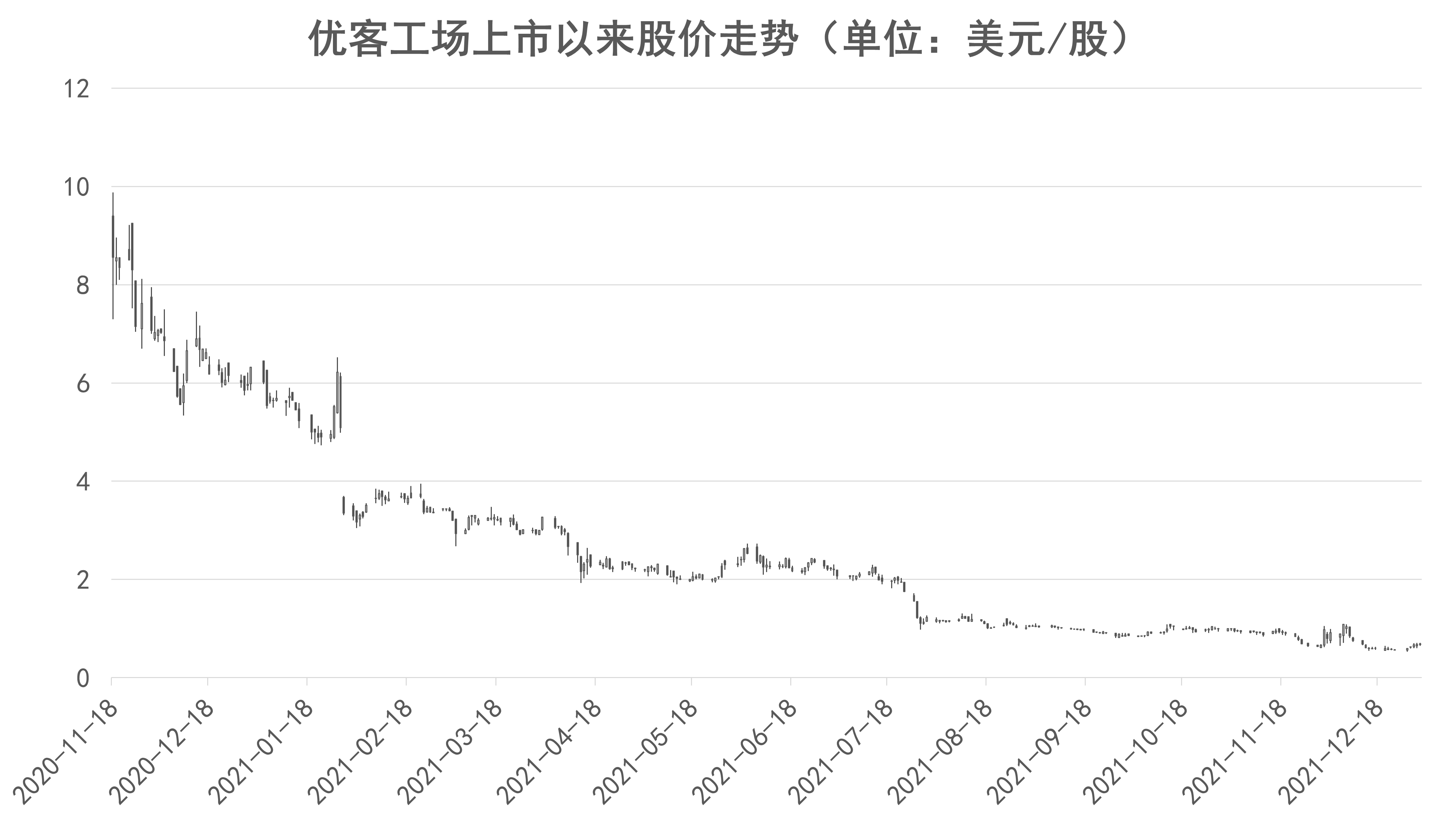 截至2022年3月15日,優(yōu)客工場(chǎng)市值僅為2083.52萬美元,相比D輪融資的30億美元估值相去甚遠(yuǎn)。同時(shí)股價(jià)長(zhǎng)期來看也是走低的趨勢(shì),技術(shù)上未看到上揚(yáng)的信號(hào)。