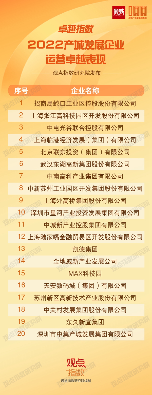 觀點指數(shù)對產(chǎn)業(yè)運營進行深度研究,遴選20家表現(xiàn)突出的企業(yè)。在“2022產(chǎn)城發(fā)展企業(yè)運營卓越表現(xiàn)”中,招商蛇口依然搶眼。