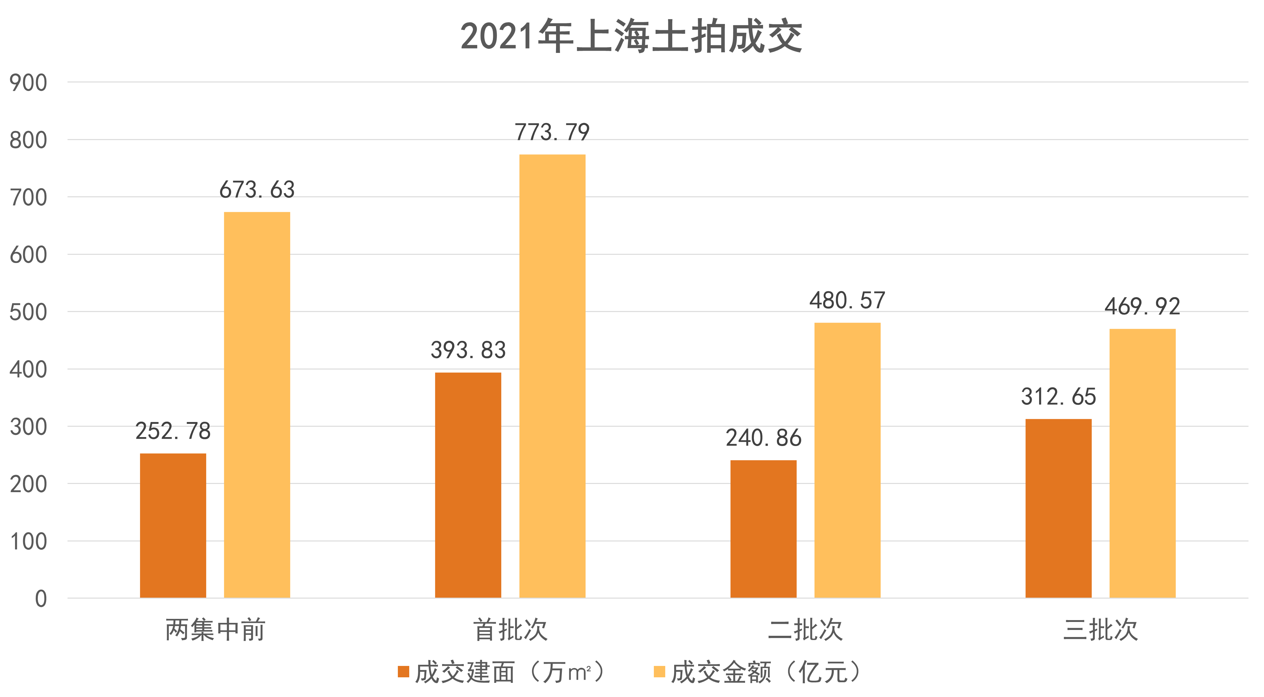 2021年,上海共集中出讓三批次地塊,熱度前高后低,二批次多宗地塊終止出讓,溢價率走低。