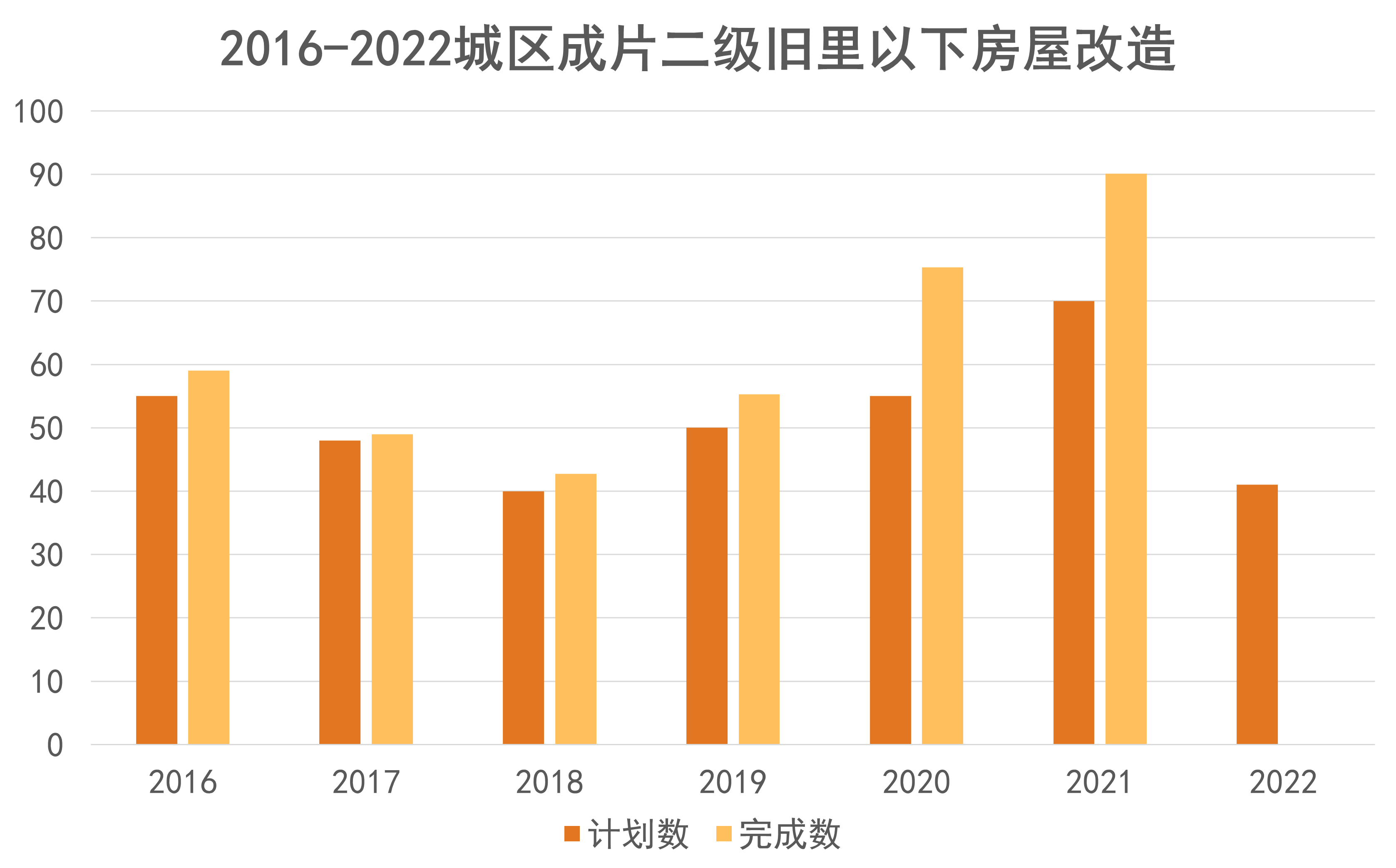 2021年計劃量為70萬平方米,實際完成90.1萬平方米。按照原定規(guī)劃,2022年將完成剩余41萬平方米的房屋改造,由于2021年的超額完成,2022年實際余量僅剩20余萬平方米,這意味著中心城區(qū)成片二級舊里以下房屋改造進(jìn)入收尾階段。