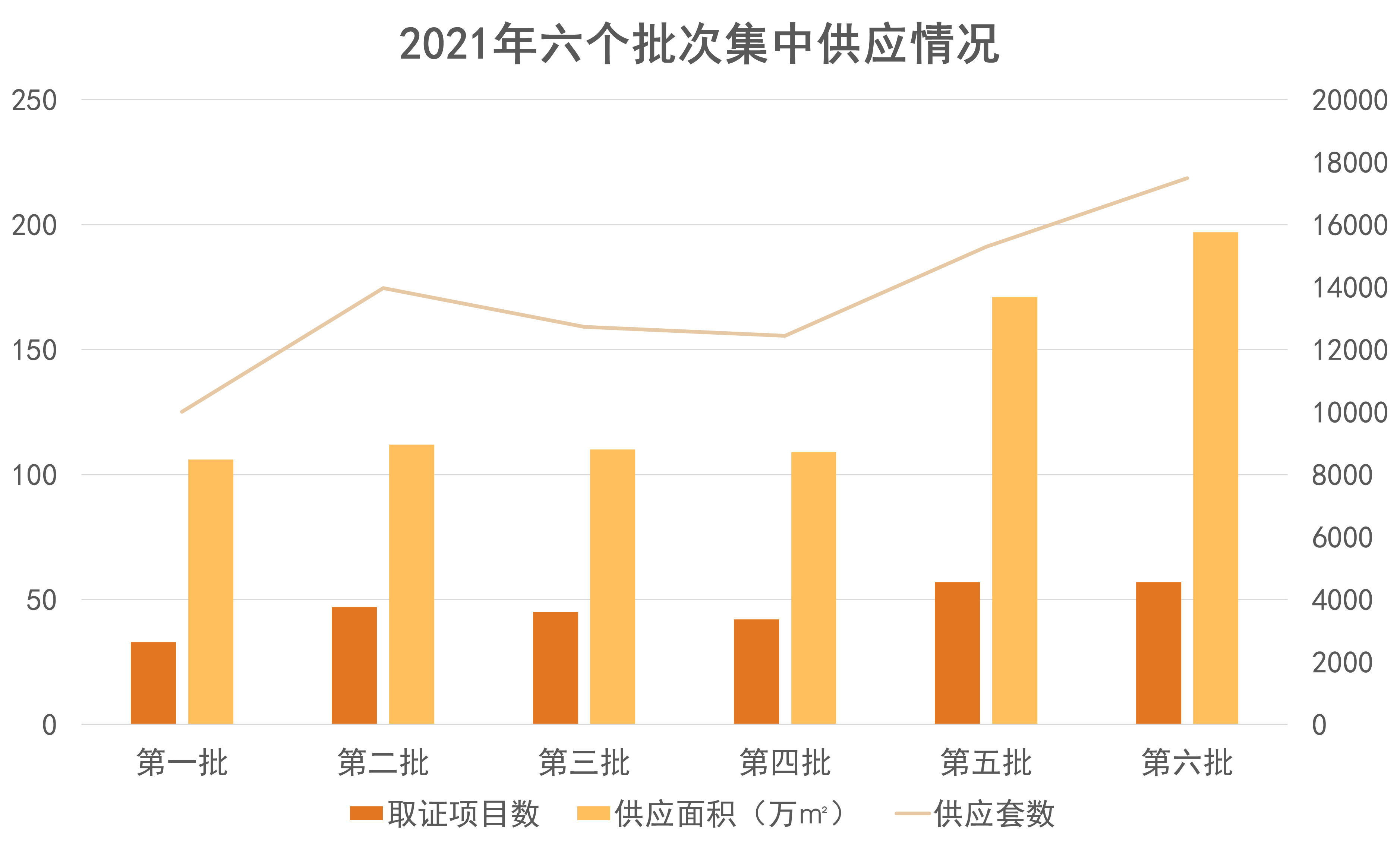 供應(yīng)上,2021年六個批次合計公示281張預(yù)售證,共計207個項目,81830套房源。而新政前取證25張,由此計算全年合計供應(yīng)306張預(yù)售證,創(chuàng)3年歷史新高。