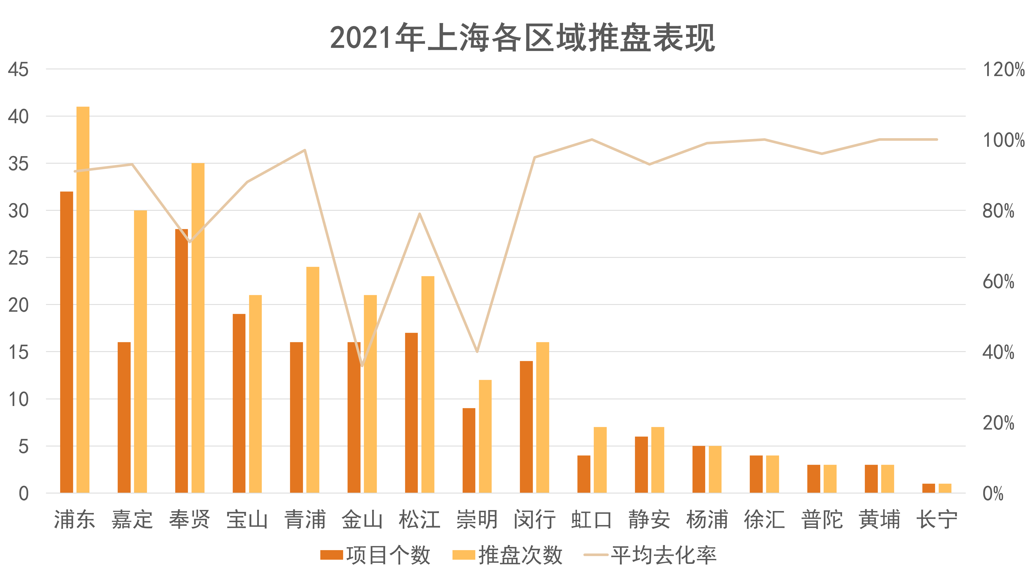 分區(qū)域看,浦東項目個數(shù)及推盤次數(shù)最多,2021年全年共有32個項目開盤,合計推盤41次,平均去化率較好,達(dá)91%;市區(qū)共26個項目開盤,推盤30次,供應(yīng)較低但成交表現(xiàn)優(yōu)異。