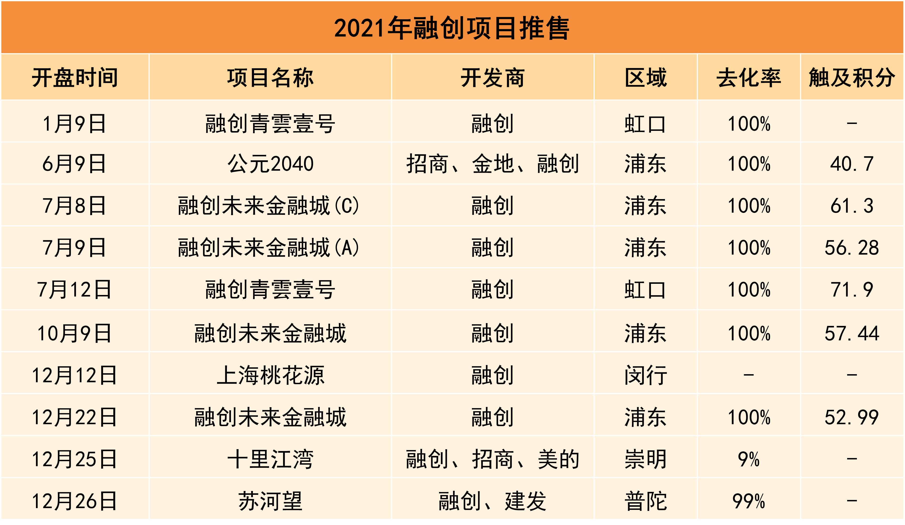 融創(chuàng)在售項目有公園2040、融創(chuàng)未來金融城、融創(chuàng)青雲(yún)壹號、上海桃花源、十里江灣、蘇河望等多個項目,2021年共推盤10次,其中6次觸及積分制。