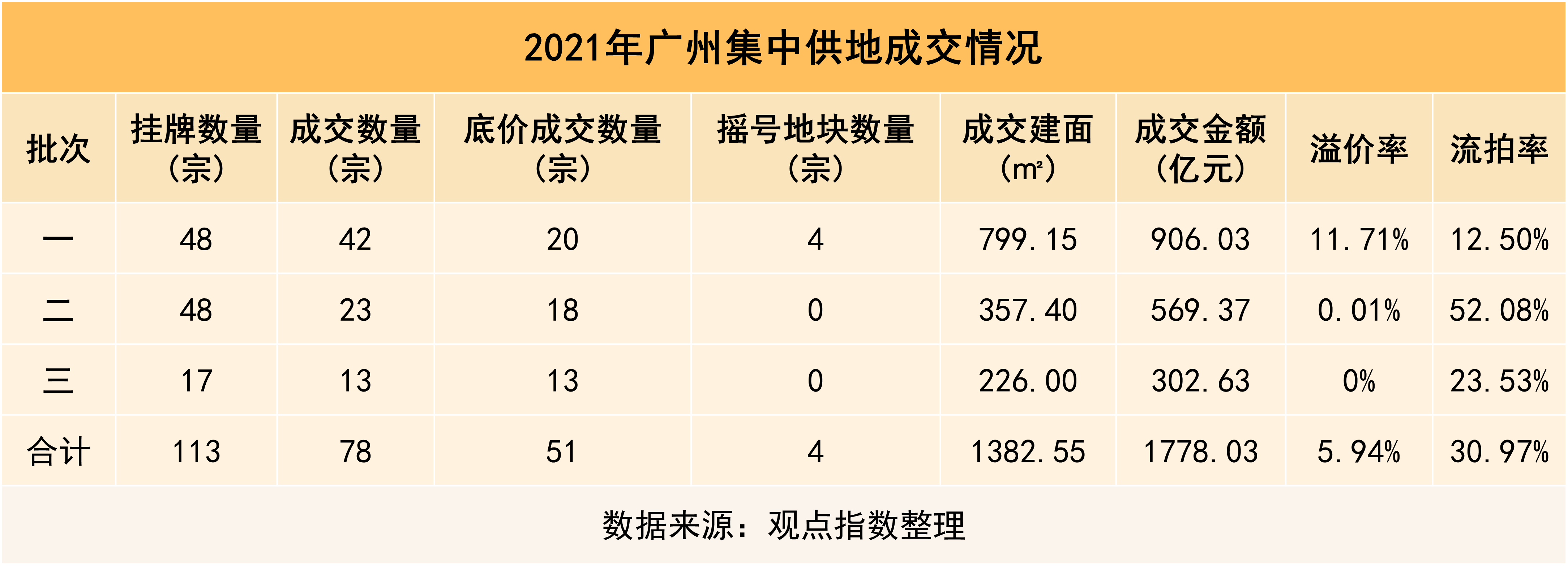 觀點(diǎn)指數(shù) 2021年一二季度,全國房地產(chǎn)市場迎來密集調(diào)控期,廣州2021年房地產(chǎn)市場政策呈現(xiàn)出從密集調(diào)控到持續(xù)監(jiān)督的表現(xiàn),而宅地供應(yīng)方面,整體成交量不及預(yù)期,呈現(xiàn)出高開低走的趨勢,成交地塊數(shù)量不斷減少,溢價(jià)率持續(xù)下降。