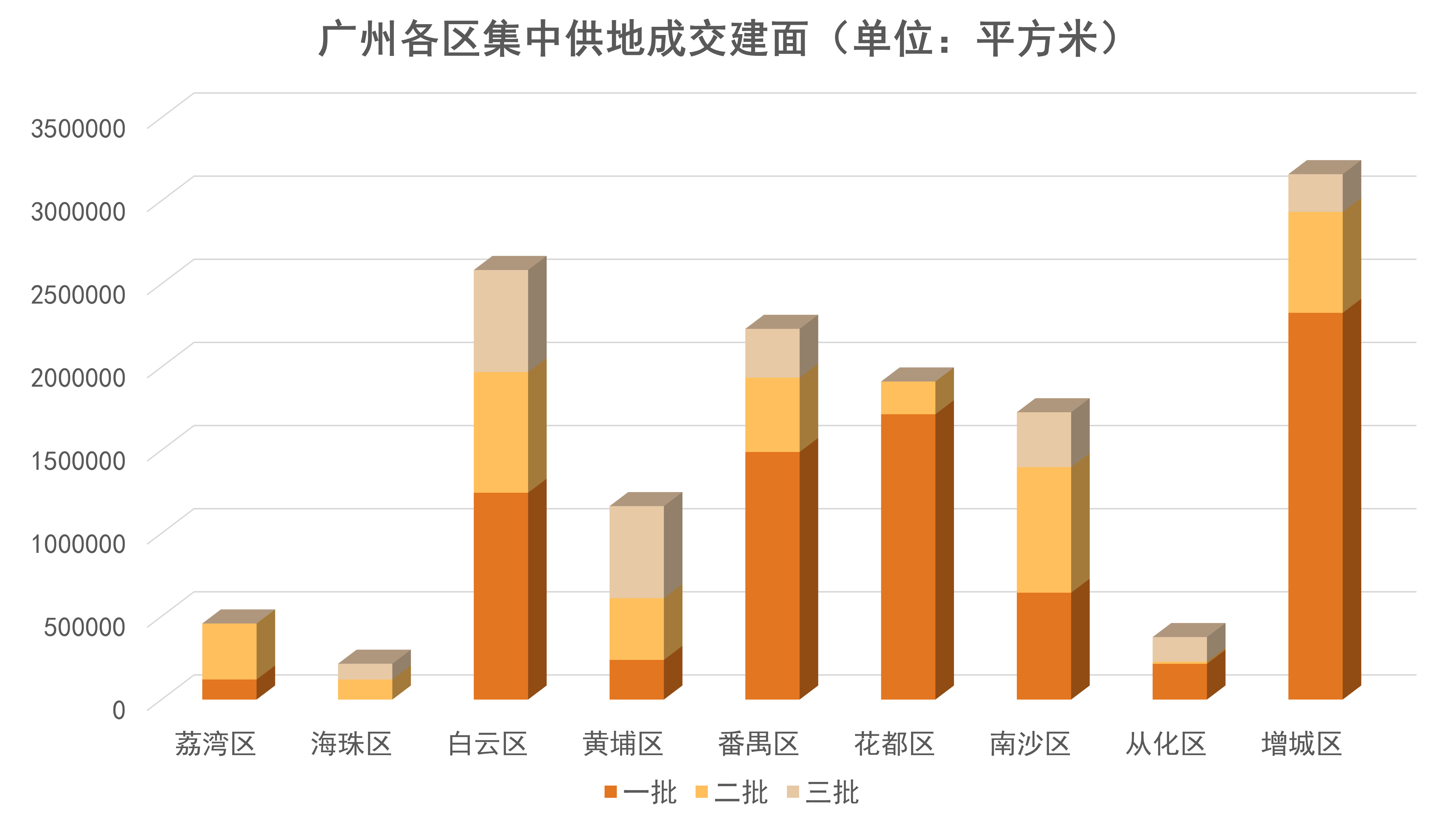 分區(qū)域看,白云區(qū)全年成交相對(duì)穩(wěn)定,第二、第三批次成交建面相差不大;而番禺區(qū)、增城區(qū)和花都區(qū)的成交熱度則有明顯變化。