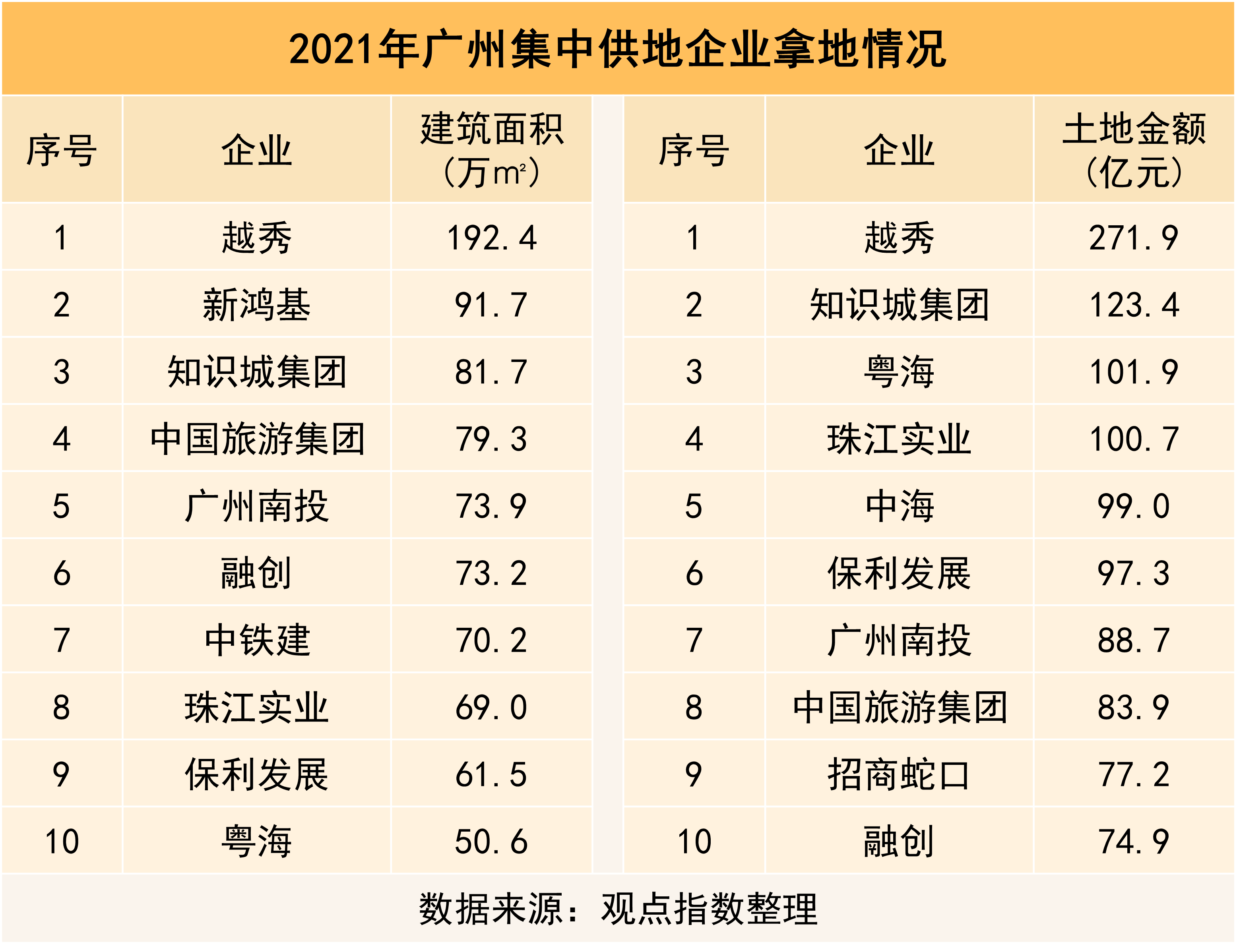 越秀全年拿下9宗地塊,總金額272億元,合計(jì)建筑面積192萬平方米,成為全年拿地?cái)?shù)量、金額、建筑面積最多的企業(yè)。其中,7宗地塊屬于第一批次,2宗地塊屬于第二批次;盡管在第一批次中拿下較多地塊,但僅3宗地為溢價(jià)成交。