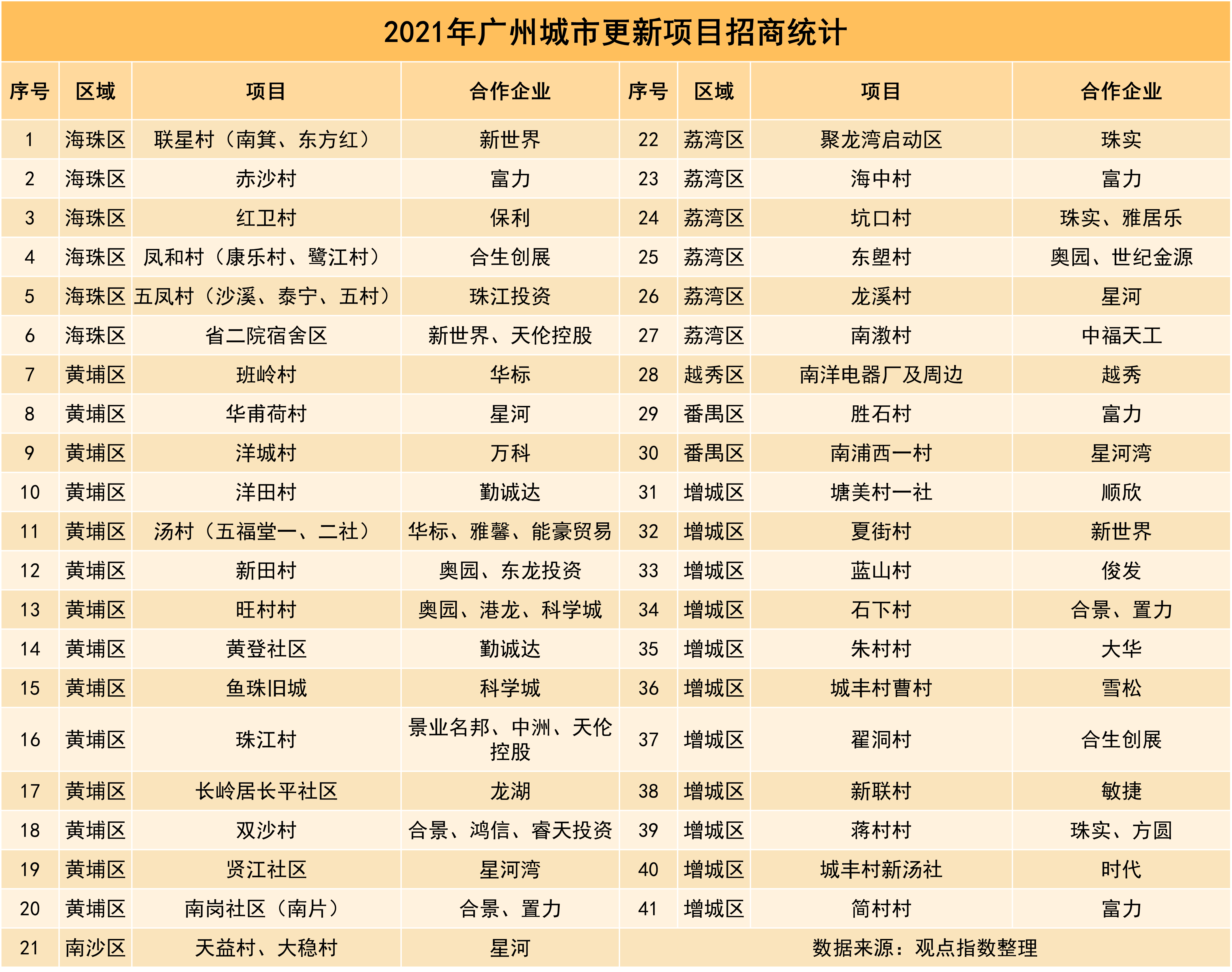 根據(jù)觀點(diǎn)指數(shù)統(tǒng)計(jì),2021年廣州共有41個(gè)舊改項(xiàng)目完成合作招商,涉及8個(gè)區(qū),其中黃埔區(qū)14個(gè),增城區(qū)11個(gè),海珠區(qū)和荔灣區(qū)各6個(gè),番禺區(qū)2個(gè),越秀區(qū)和南沙區(qū)各1個(gè),而天河區(qū)缺席。