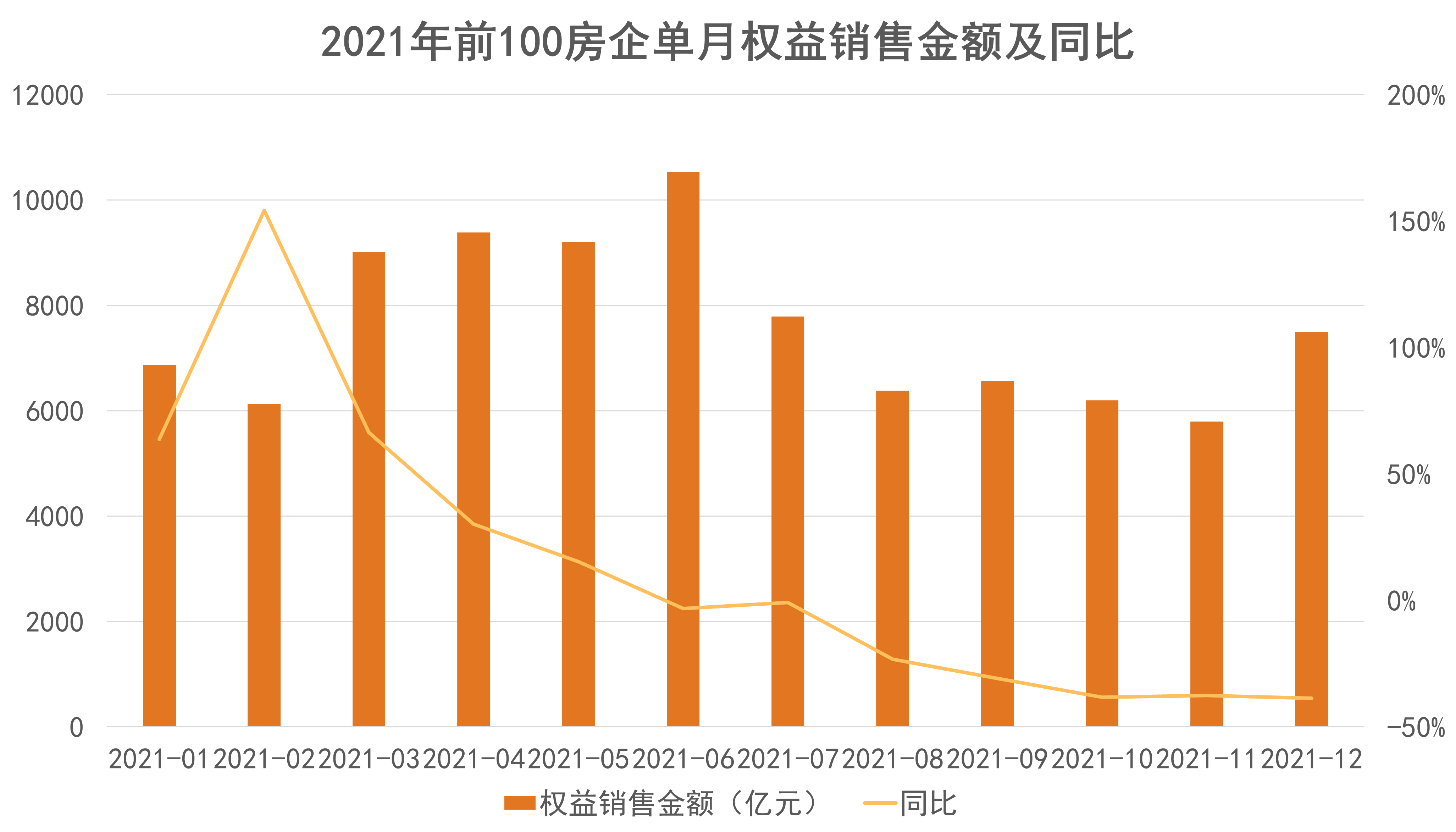 12月單月,前100房企實(shí)現(xiàn)權(quán)益總銷售金額7557億元,環(huán)比增長(zhǎng)30.4%,但對(duì)比2020年同期減少38.2%,在行業(yè)景氣下行的環(huán)境,年底樓市銷售明顯失速。
