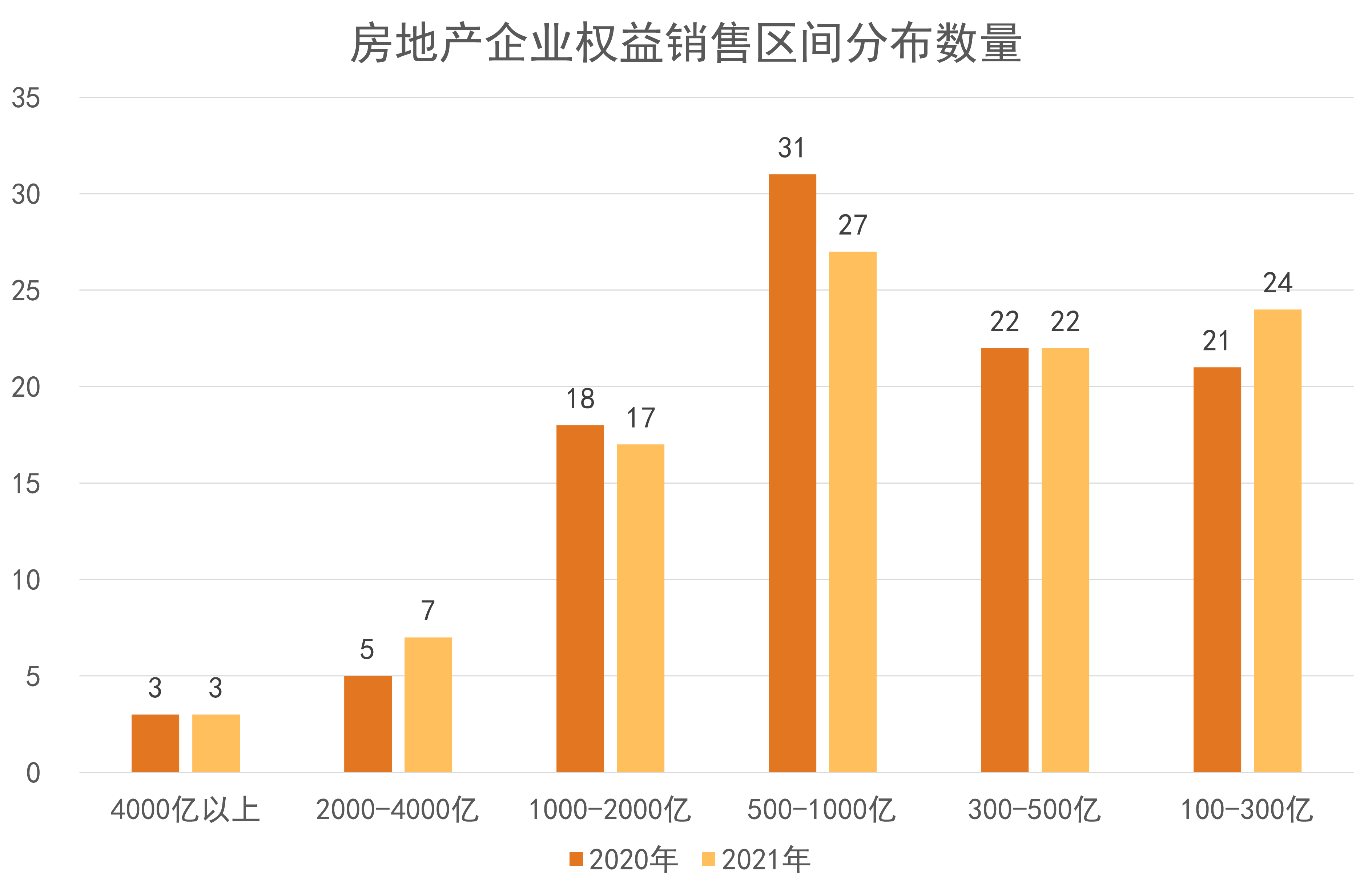 觀察 2021年權(quán)益銷售企業(yè)區(qū)間分布情況,27家房企突破千億門檻,與去年持平。10家房企銷售規(guī)模超過(guò)2000億元,較去年增加2家。權(quán)益銷售位于1000-2000億元的房企數(shù)量由2020年的18家降至17家。