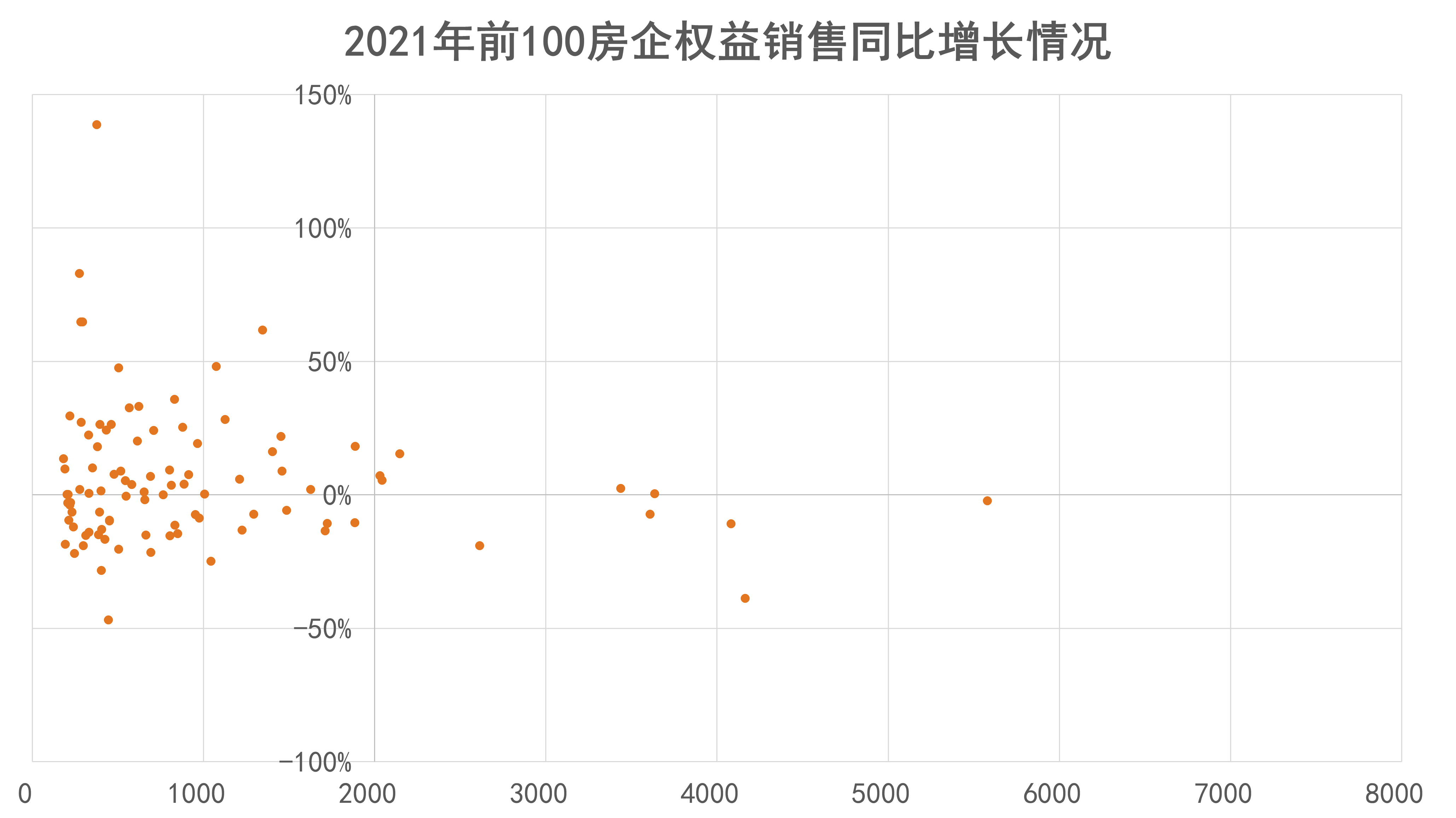 從整體銷售增速來(lái)看,前100房企中,48家權(quán)益銷售金額不及2020年,錄得銷售同比為負(fù)。其中,25家房企銷售同比降幅超過(guò)10%,7家房企降幅超過(guò)20%。