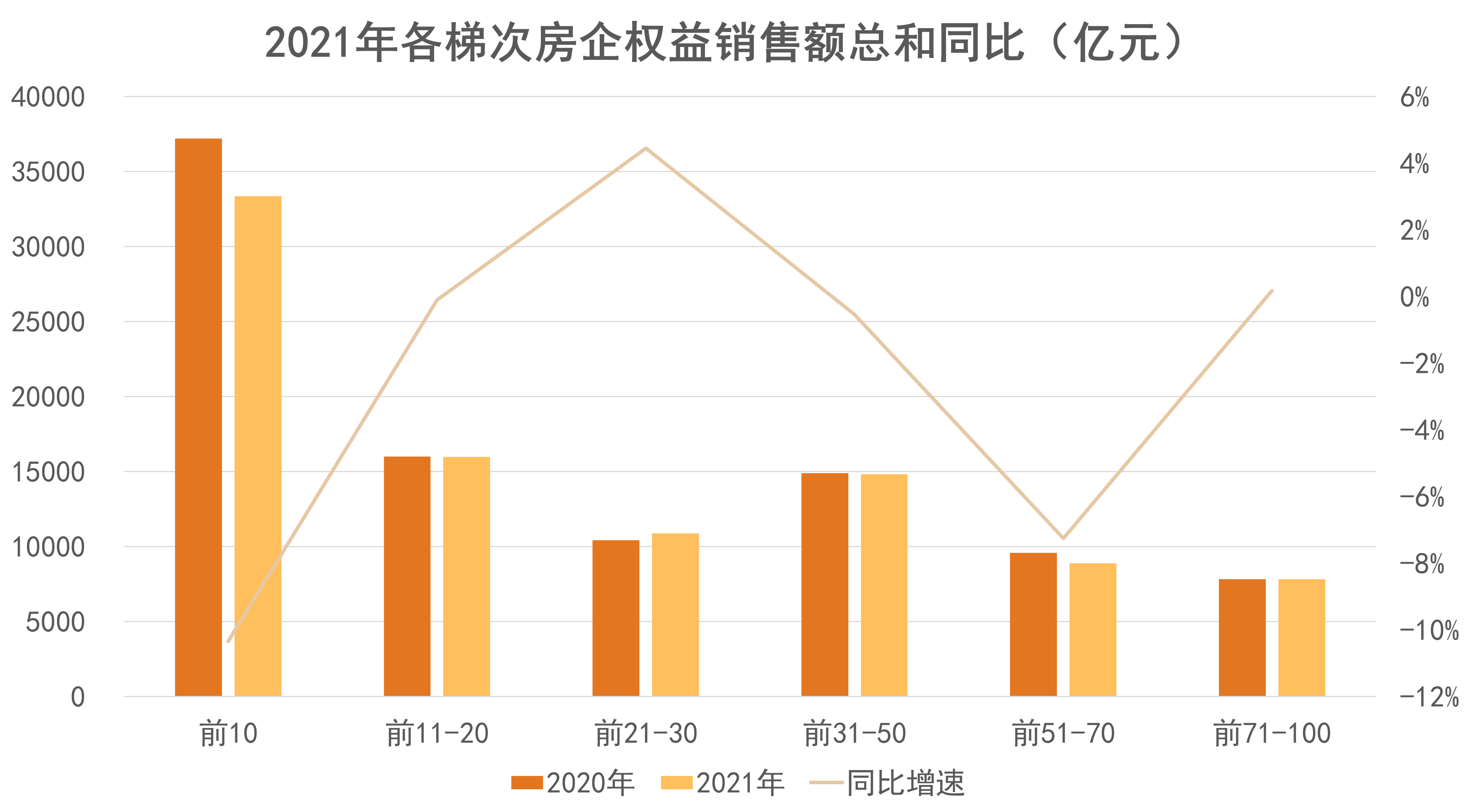 從2021年各梯次房企銷售情況來(lái)看,位于前21-30房企全口徑銷售金額總和同比增長(zhǎng)幅度最大,為4.4%。前10房企同比增速最低,為-10.3%。