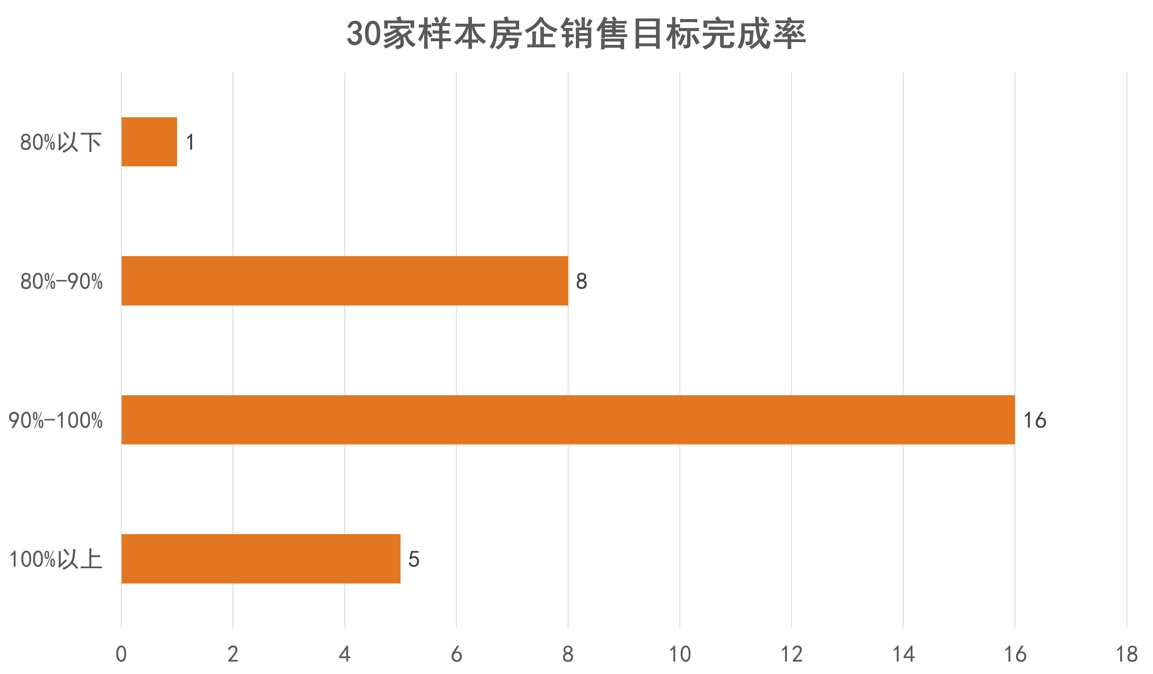 30家樣本房企中,完成全年銷售目標(biāo)的僅有5家,分別是綠城中國(guó)、濱江集團(tuán)、越秀地產(chǎn)、首開股份以及華潤(rùn)置地,占比16.7%。16家房企銷售目標(biāo)完成率位于90%-100%之間;8家房企銷售目標(biāo)完成率位于80%-90%之間;剩余1家房企銷售目標(biāo)完成率低于80%,占比3.3%。