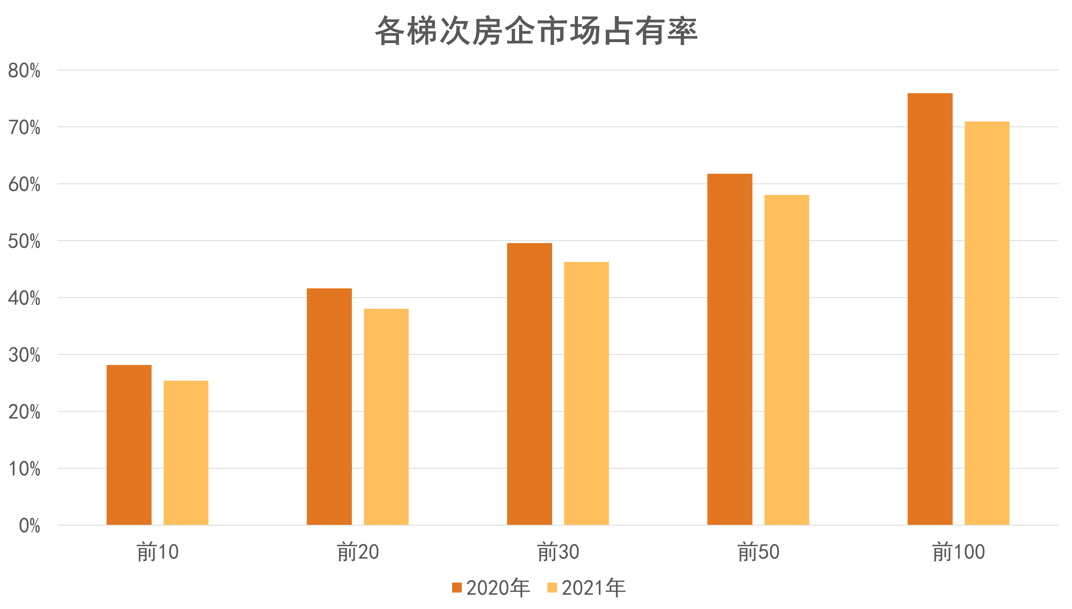 市占率方面,2021年全國(guó)商品房銷售額達(dá)到18.2萬(wàn)億元,以此計(jì)算,前100房企市占率為70.9%,較2020年下降5個(gè)百分點(diǎn),前50房企市占率為46.3%,較2020年下降3.3%個(gè)百分點(diǎn)。