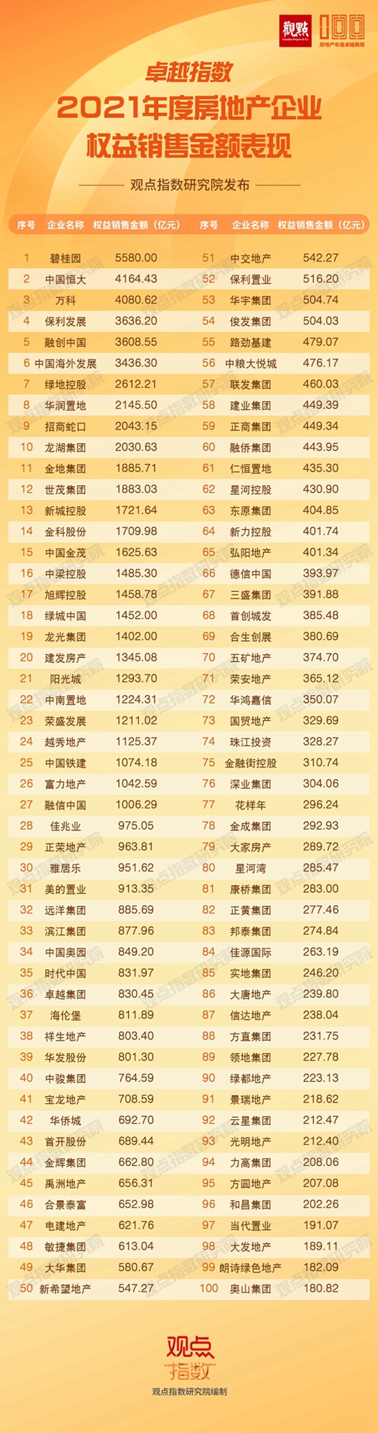 觀點(diǎn)指數(shù)發(fā)布的“2021年1-12月房地產(chǎn)企業(yè)權(quán)益銷售金額表現(xiàn)”研究成果顯示,前100房企實(shí)現(xiàn)權(quán)益總銷售金額9.15萬(wàn)億元,同比減少4.1%,年內(nèi)累計(jì)銷售增速首次轉(zhuǎn)負(fù)。