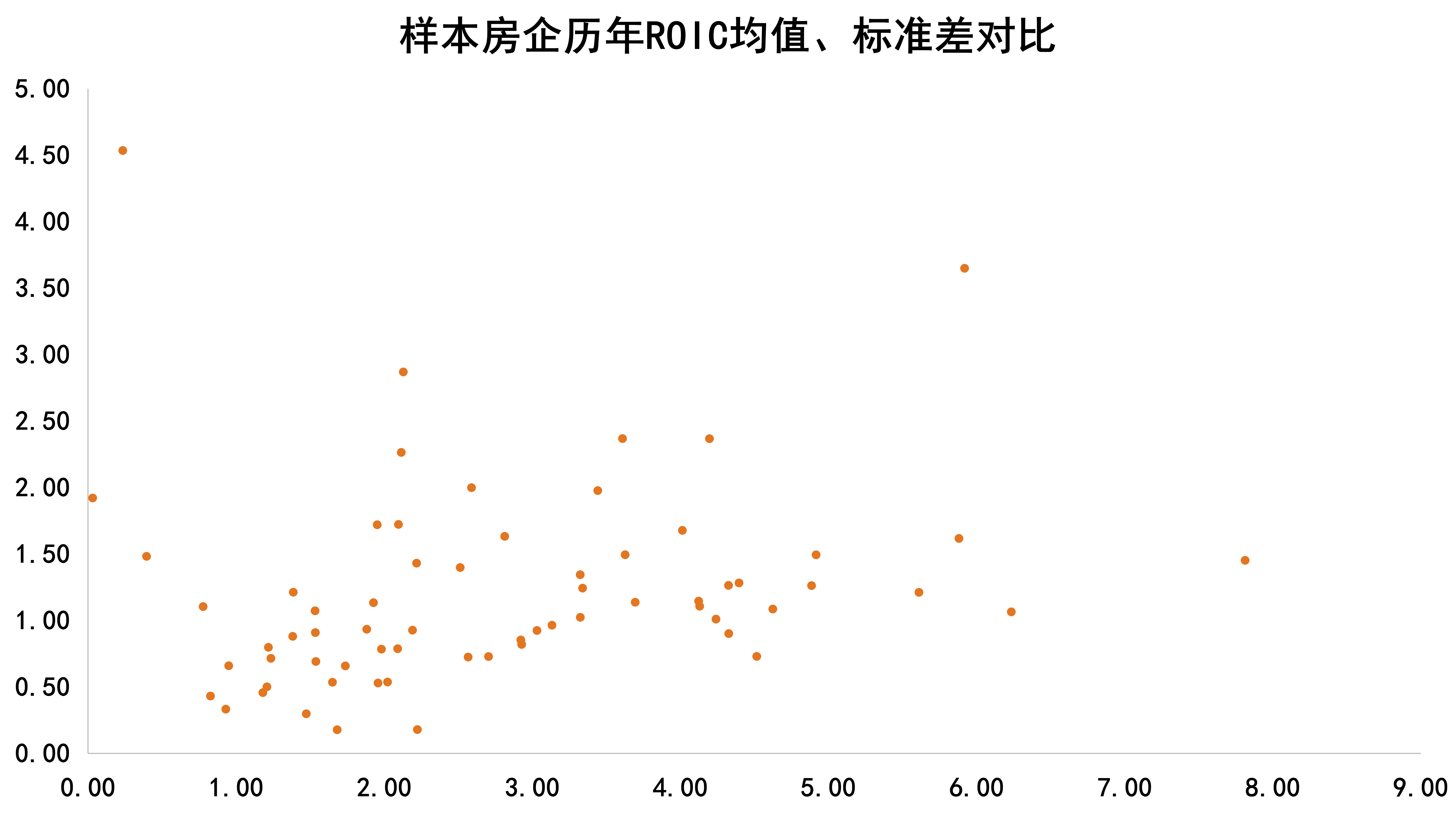 若將企業(yè)資金渠道擴大,考慮企業(yè)加杠桿進行周轉(zhuǎn)運營的情況,即上市企業(yè)凈利潤與投入資本的比值(ROIC),可以看到過去6年各家房企ROIC指標(biāo)標(biāo)準(zhǔn)差多處于0.5-1.5之間,ROA整體水平基本保持穩(wěn)定。