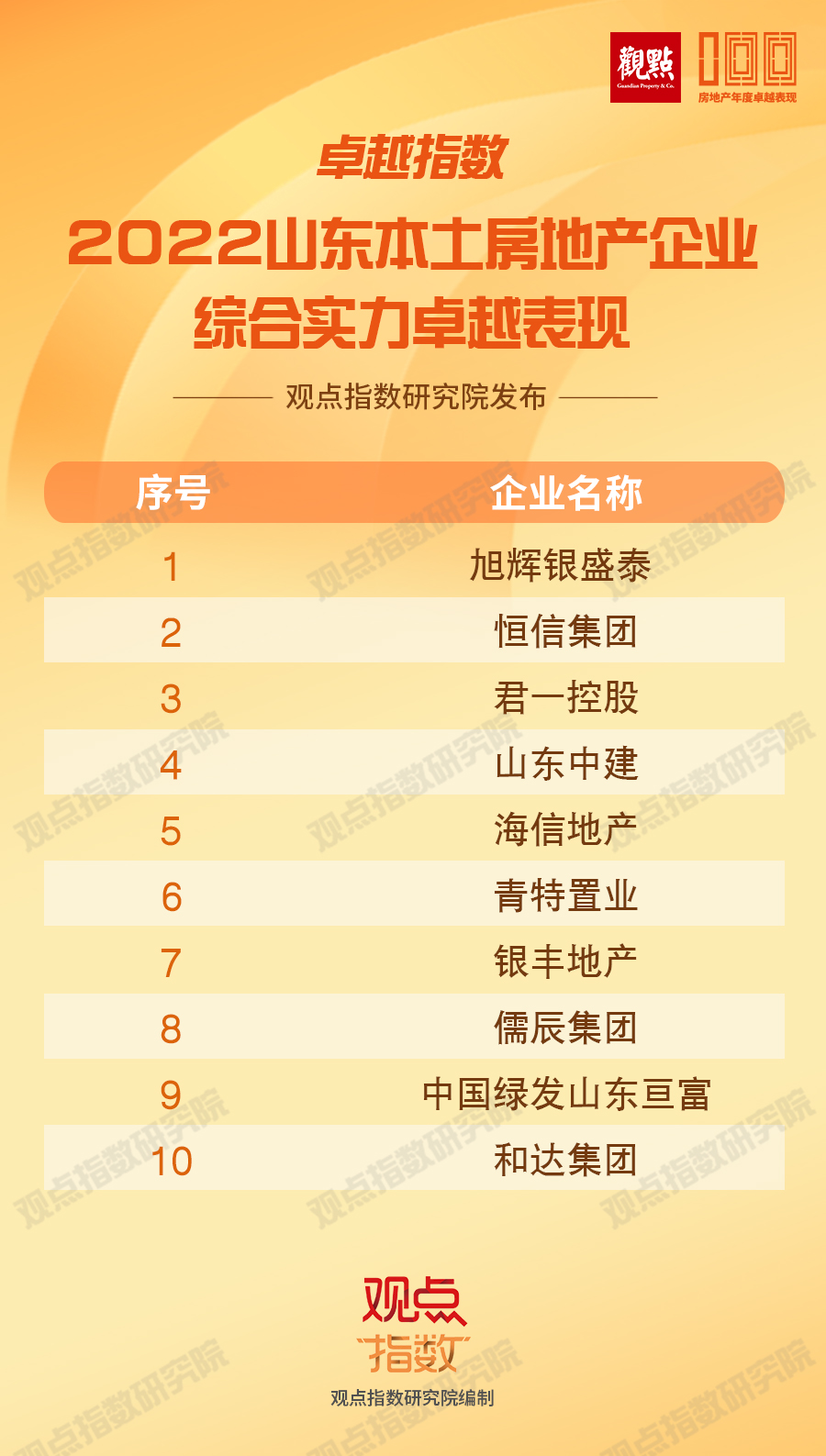 觀點(diǎn)指數(shù)發(fā)布的“2022山東本土房地產(chǎn)企業(yè)綜合實(shí)力卓越表現(xiàn)”顯示,旭輝銀盛泰、恒信集團(tuán)、君一控股表現(xiàn)亮眼,而山東中建、海信地產(chǎn)、青特置業(yè)也有優(yōu)異成績(jī)。