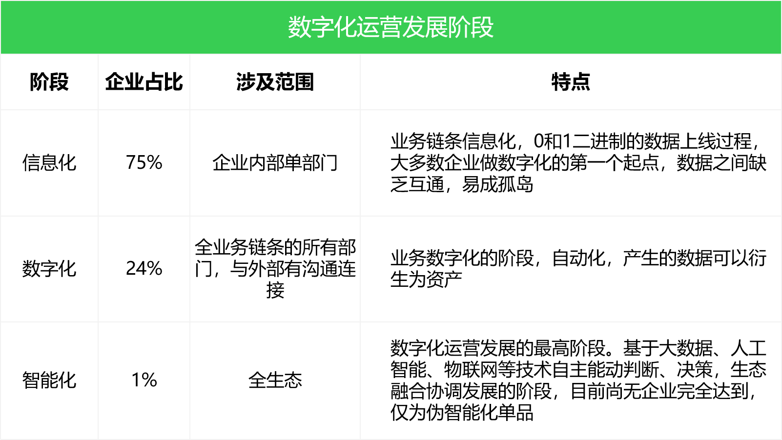 從調(diào)研結(jié)果來看,目前行業(yè)內(nèi)大多數(shù)企業(yè)的數(shù)字化運營仍處于數(shù)據(jù)上線的“信息化階段”。在處理能力、響應(yīng)速度、解決問題等方面距離真正意義上的“智能化”道阻且長。