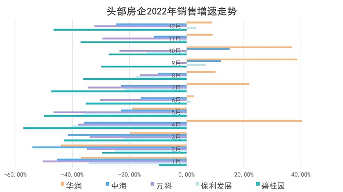 觀察前五企業(yè),華潤(rùn)置地2022年銷(xiāo)售增速超過(guò)其他房企,但在上半年同樣呈現(xiàn)下滑趨勢(shì),到下半年才開(kāi)始發(fā)力,單月最高銷(xiāo)售增速達(dá)38.8%,最高下滑幅度則是54.6%。