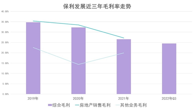 2022年上半年及三季度的數(shù)據(jù)表現(xiàn)均顯示,保利收入保持平穩(wěn),但毛利率呈下行趨勢(shì),綜合毛利至三季度末約為24.51%,分別較年初及上半年下滑2.04個(gè)點(diǎn)、1.04個(gè)點(diǎn),與行業(yè)下行趨勢(shì)一致。